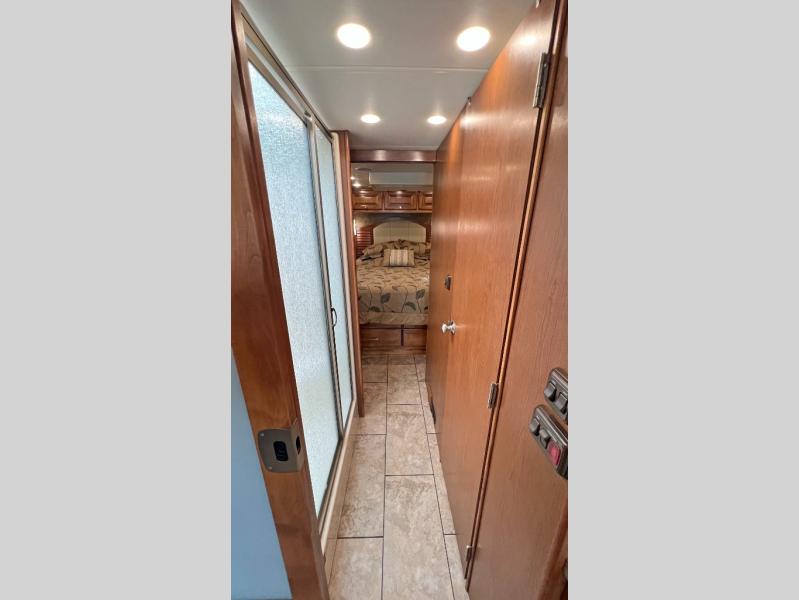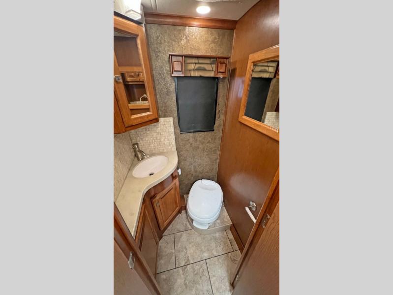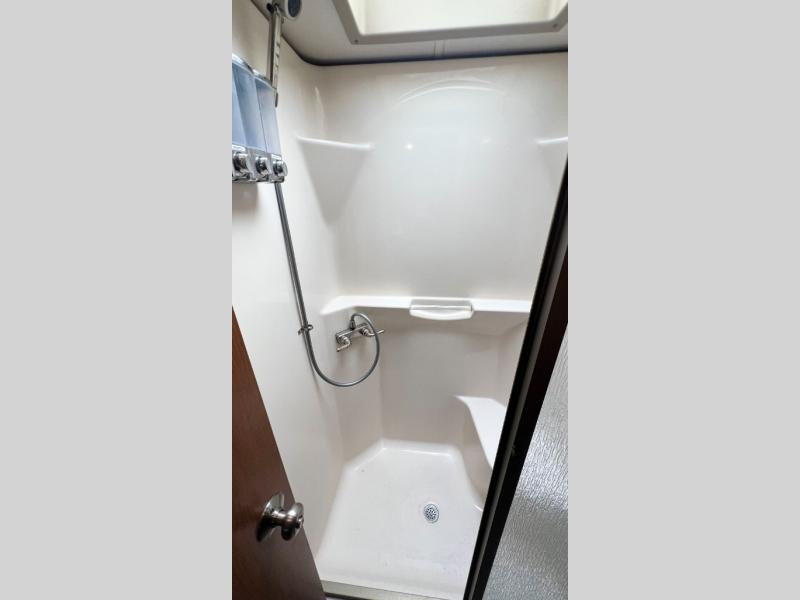 Continuing toward the rear of the motor home you will find that the bathroom is split with a private toilet area and a sink on one side of the motor home. The shower is across from the private toilet area.