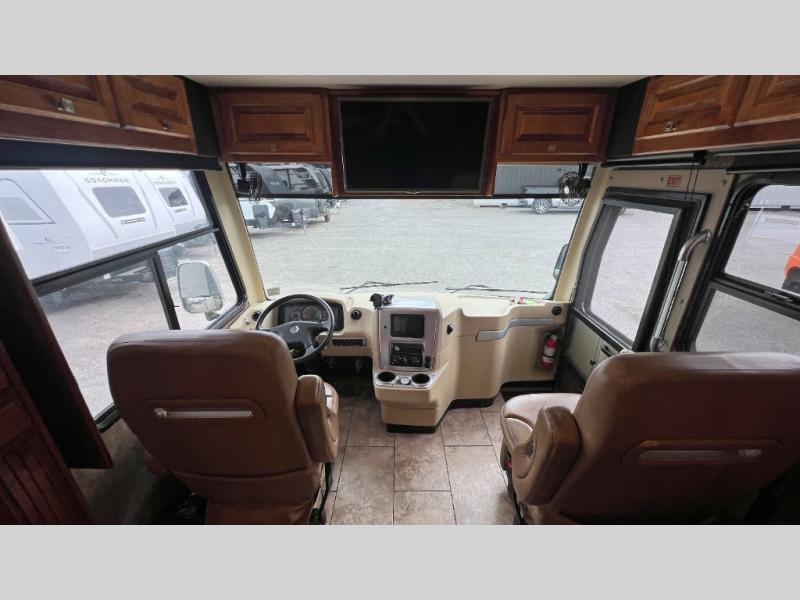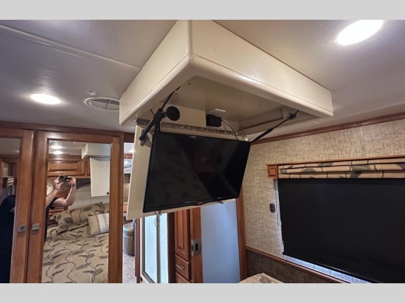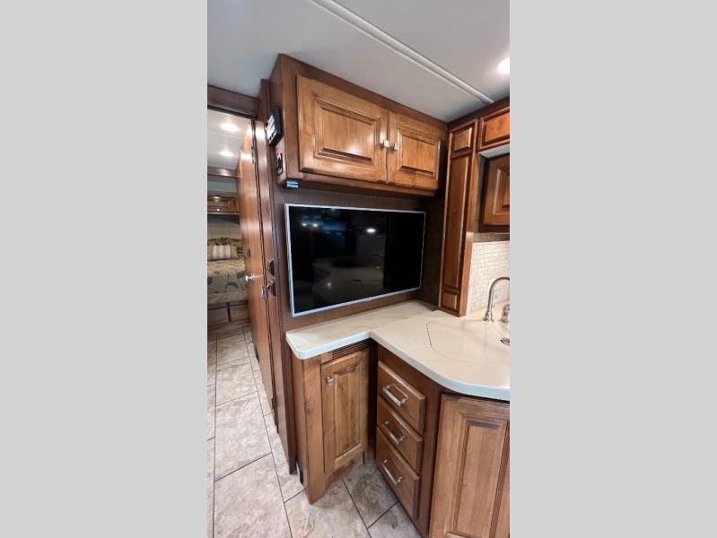 Step into the front entry to find two captains chairs, overhead cabinets, and an optional TV at the center front.