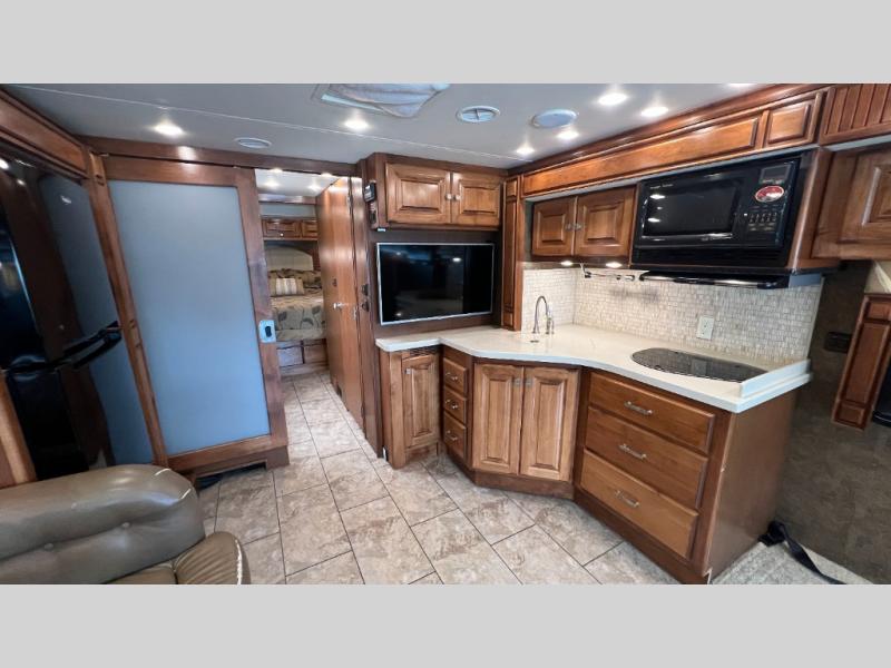 The road side features a slide with a sofa bed, two burner range top, overhead microwave, corner angled double sink and lots of overhead cabinets. A TV is on an inside wall near the sink, and it faces the front of the coach.