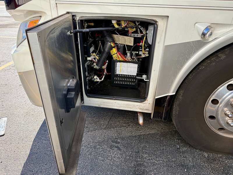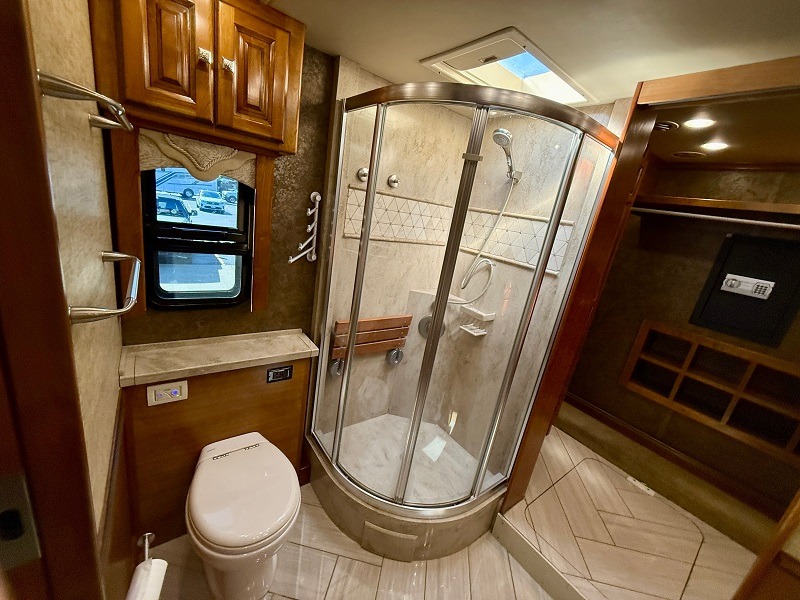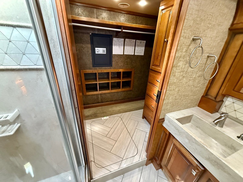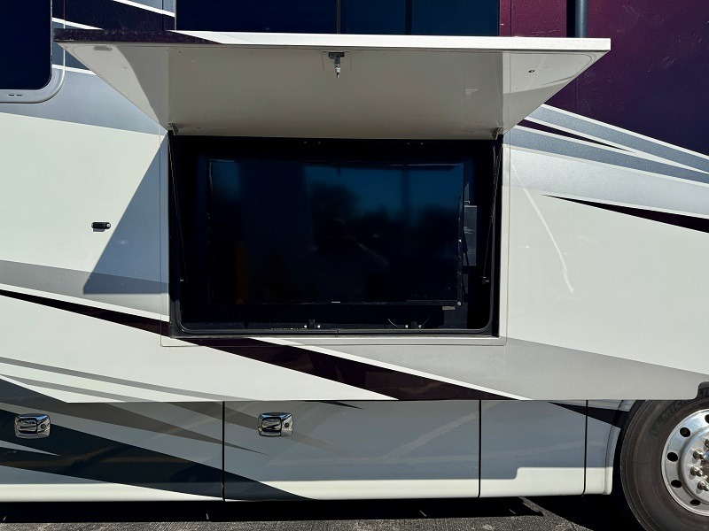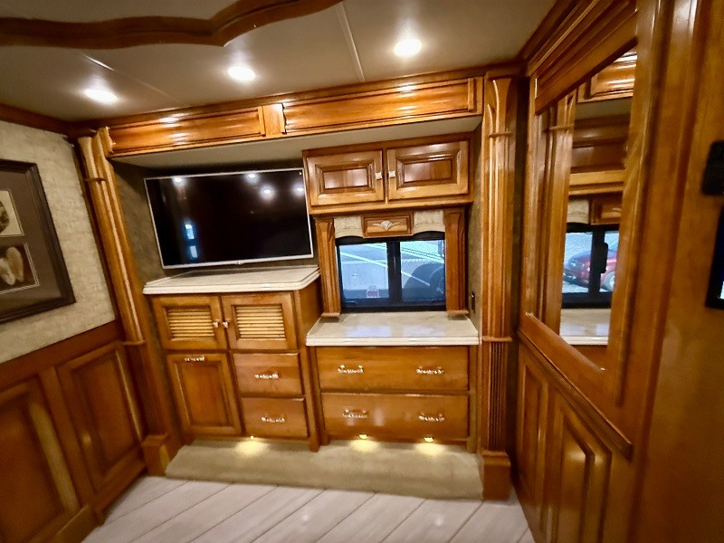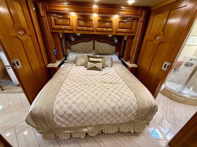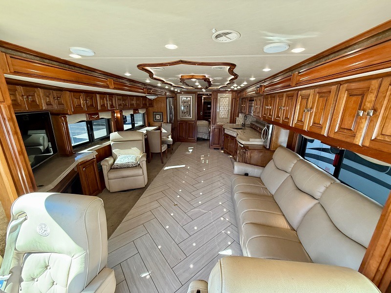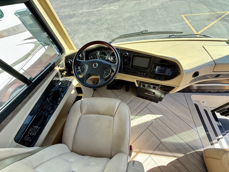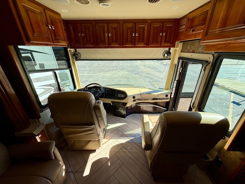 The outside is an art piece all in itself with its full body paint that will be turning heads as you drive down the road. Now, step inside and see the beauty on the inside of this luxury coach. Starting up front with the ultra leather driver and cab seats that are as lush as they look. The view is incredible both inside and out. You will find plenty of overhead storage cabinet all throughout so you don't have to leave anything behind.
