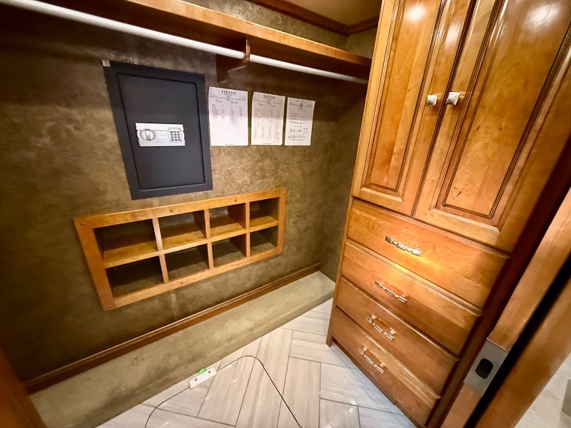 The bedroom is next with a slide-out queen bed including nightstands on both side. The slide opposite features a counter area with drawers beneath, and a TV plus overhead cabinets for storing some of your things.