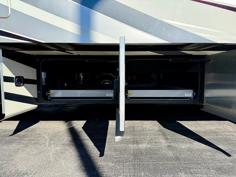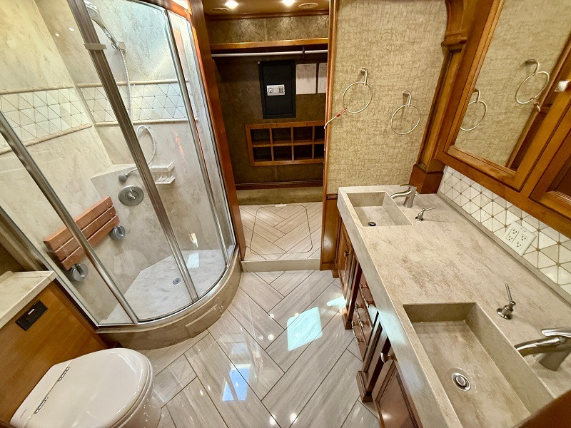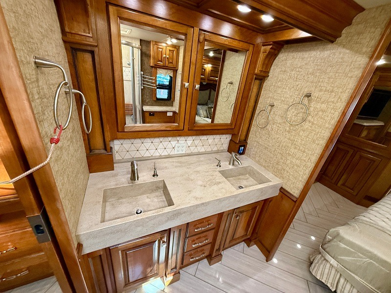 The living area and kitchen are found up front with two large slides opposite one another. The passenger side features a sofa bed, dinette with computer work station off to one side, and a residential refrigerator just like home. Off the driver's side you have an L-shaped chaise sofa with coffee table, kitchen counter, range with microwave above, and double kitchen sink. Plus you may choose to add a drawer type dishwasher for easy cleanup.