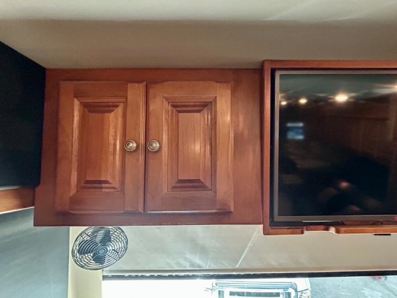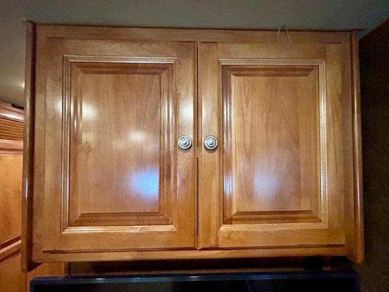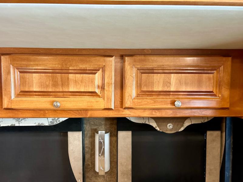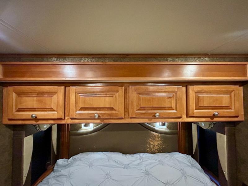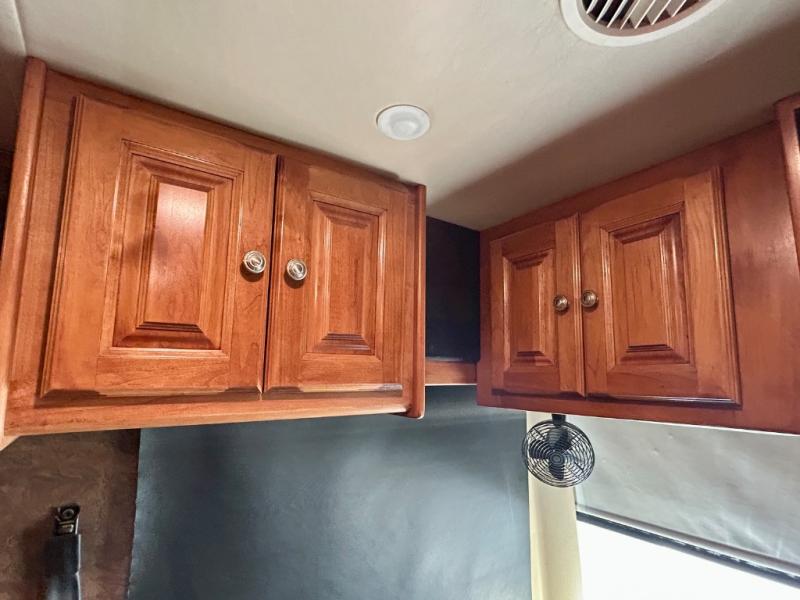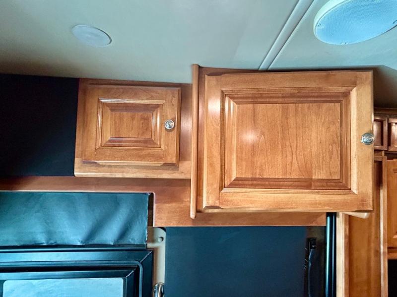The front cab area features swivel captain and passenger chairs providing added seating when parked. There is plenty of storage in overhead cabinets along the front and both sides, plus you can choose to add an optional TV if you wish.