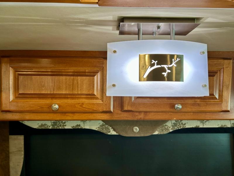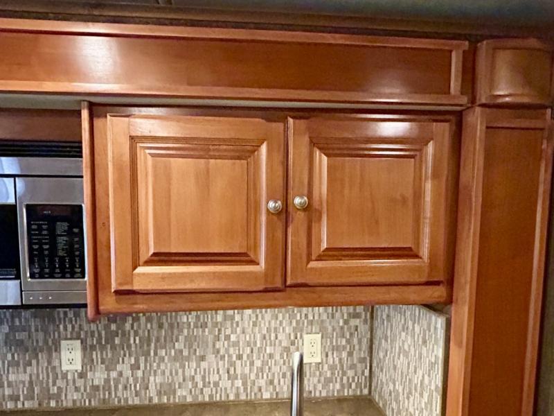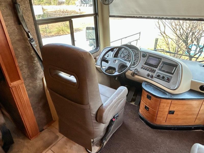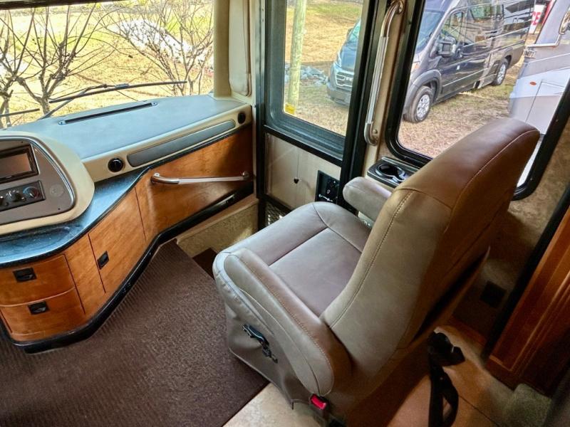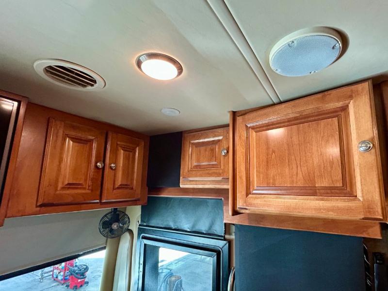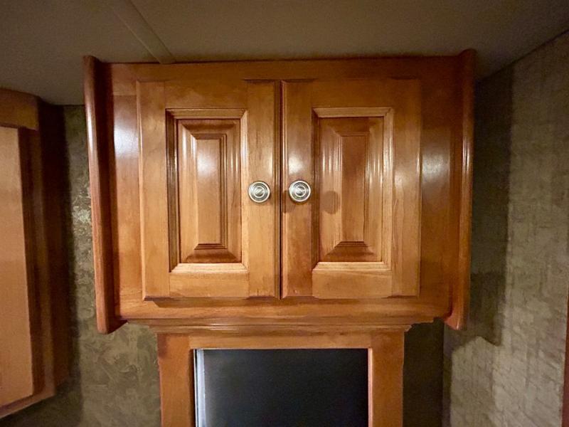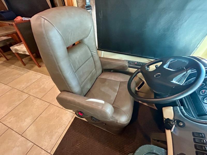 The front cab area features swivel captain and passenger chairs providing added seating when parked. There is plenty of storage in overhead cabinets along the front and both sides, plus you can choose to add an optional TV if you wish.