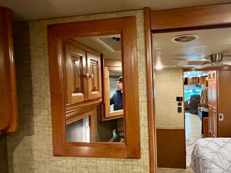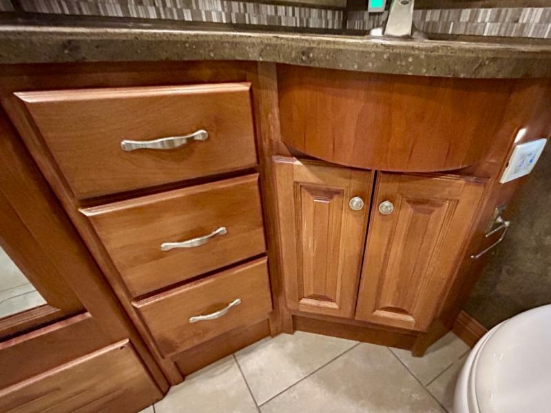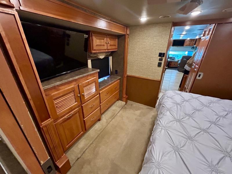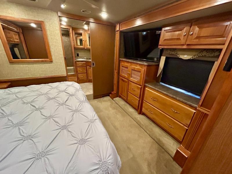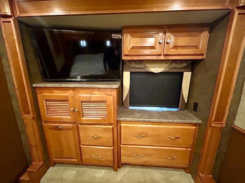 Next enjoy a bedroom area with slide out queen or optional king bed with nightstands at each side plus overhead storage. The wall opposite the bed has another slide that features a bank of drawers with overhead cabinets and a TV.