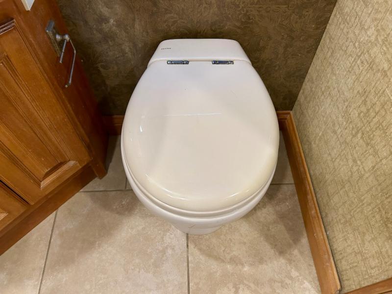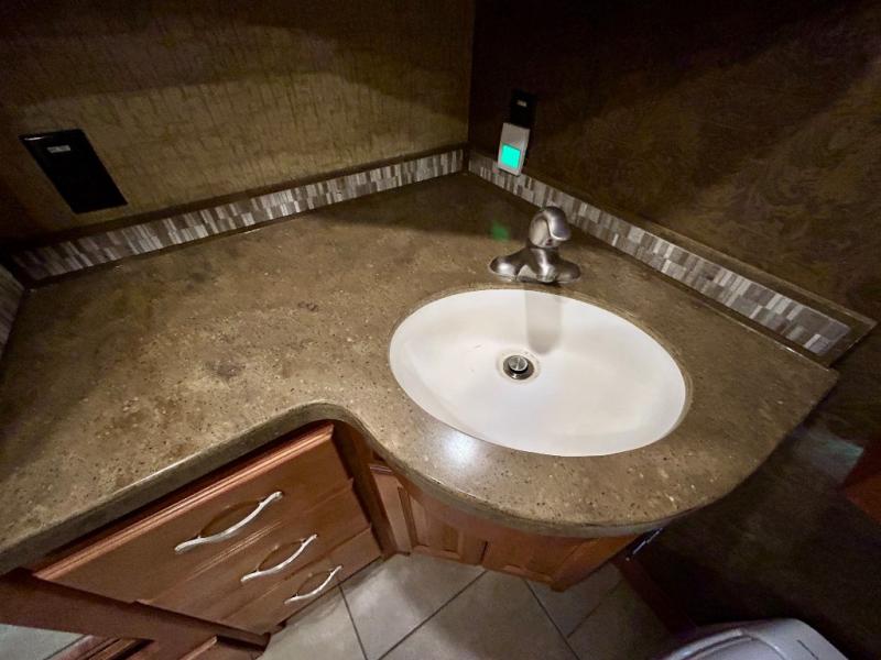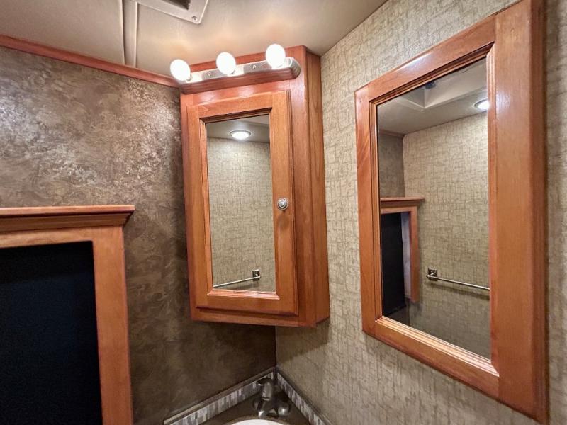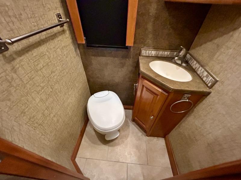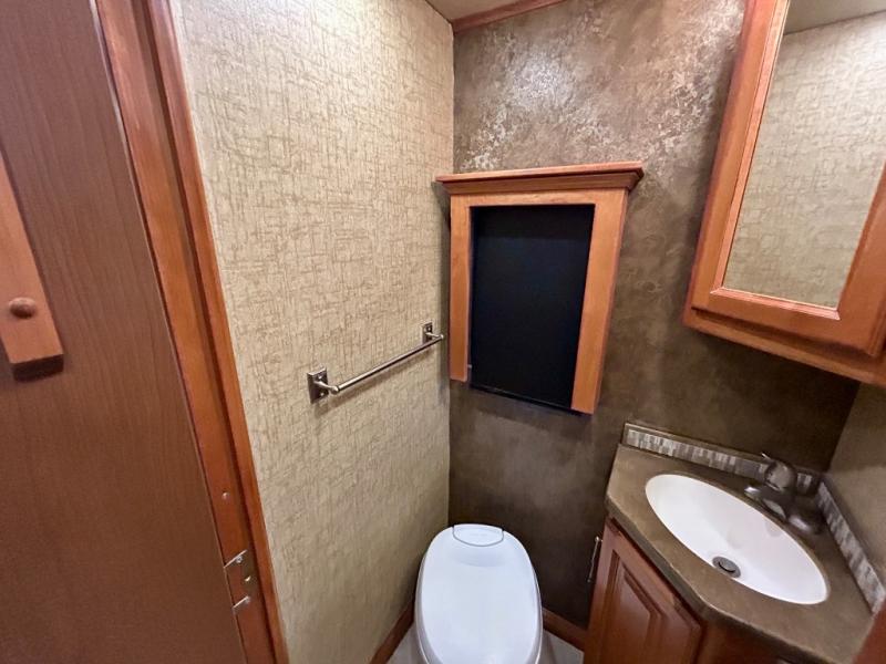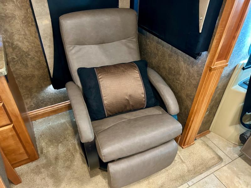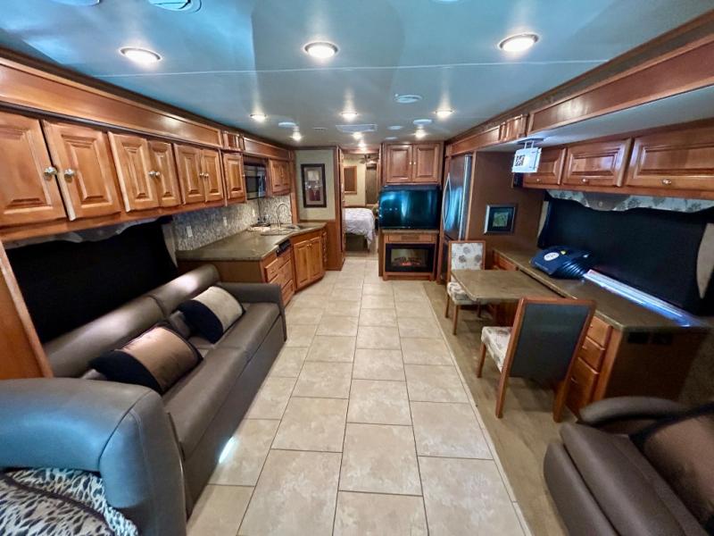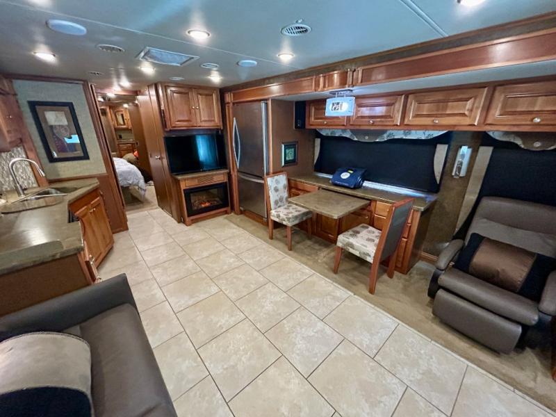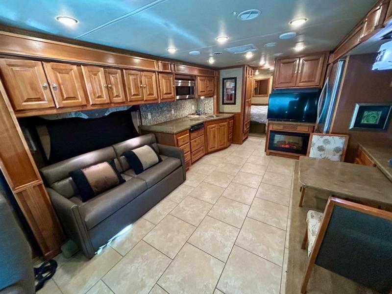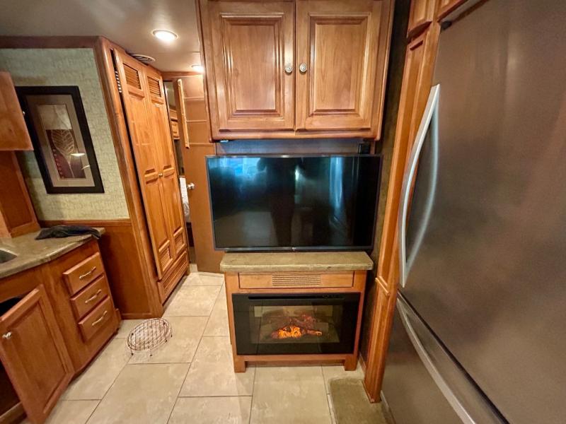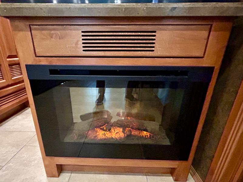 A standard TV faces the front of the coach along the interior living room wall, and you can add an optional fireplace for those cool chilly nights when you want to just stay inside.