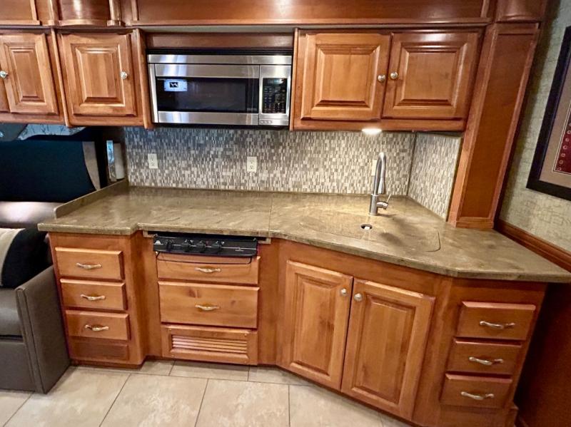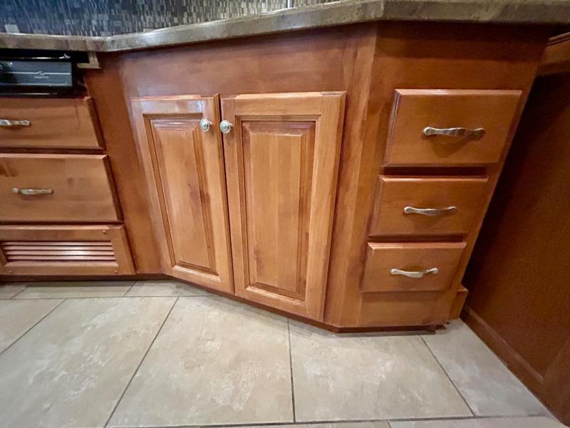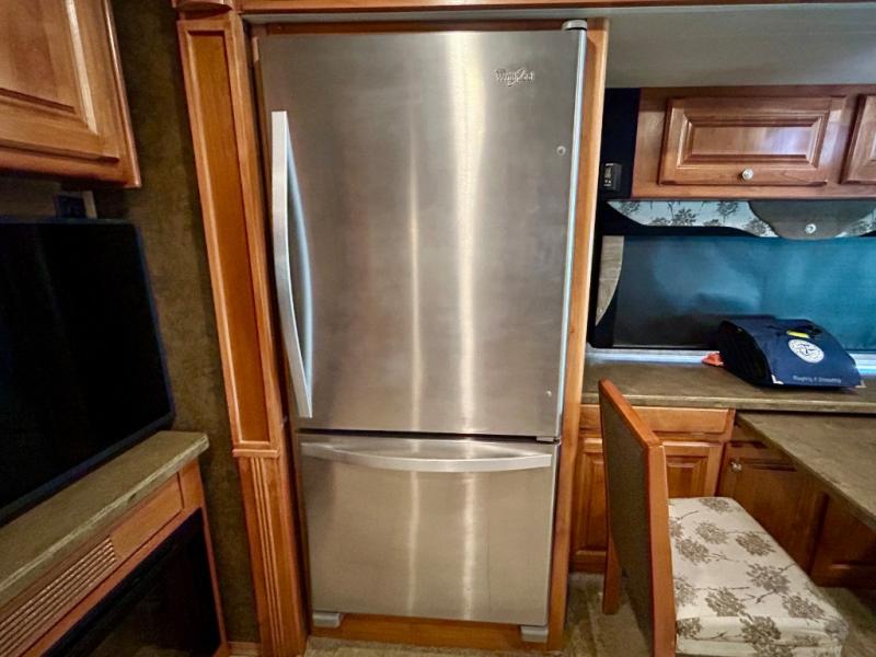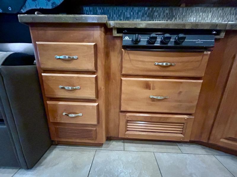 The road side provides a slide out with a generous u-shaped dinette including overhead cabinets, a partial pantry, a two-door refrigerator, and another full pantry. You may instead choose to have the slide include a lounge chair, dinette with computer workstation, overhead cabinets, refrigerator and pantry. You may also select an optional residential refrigerator for more conveniences.