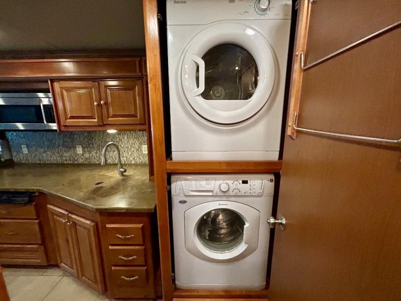 The curb side provides a slide out sofa, lots of overhead cabinets, a three burner range, overhead microwave, and angled kitchen sink. A closet for an optional washer/dryer is just off the slide out before the bedroom area.