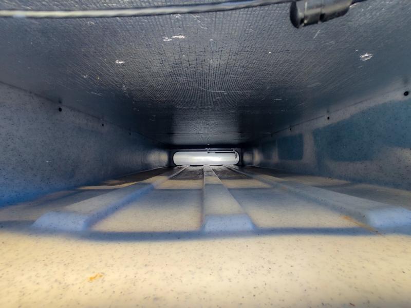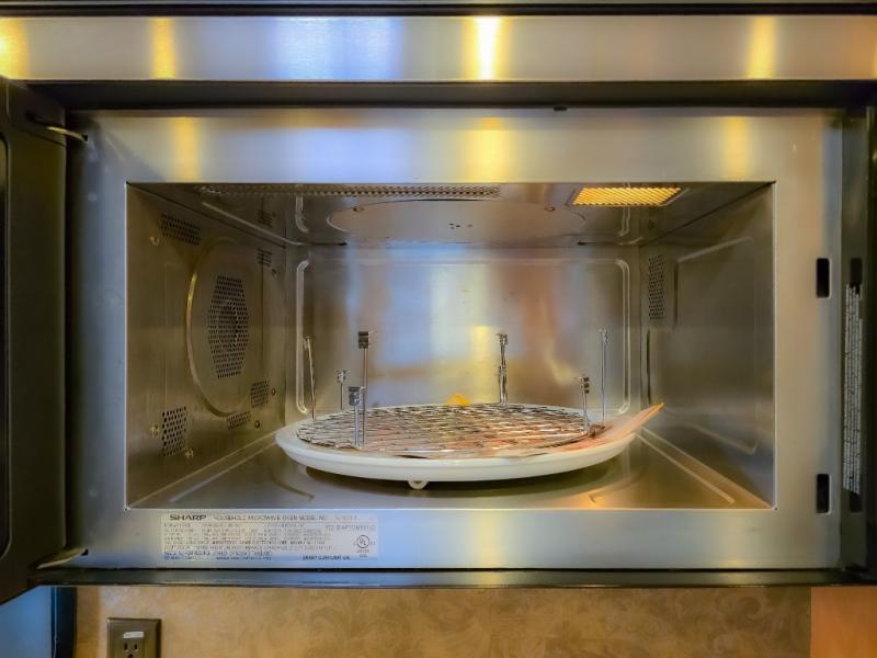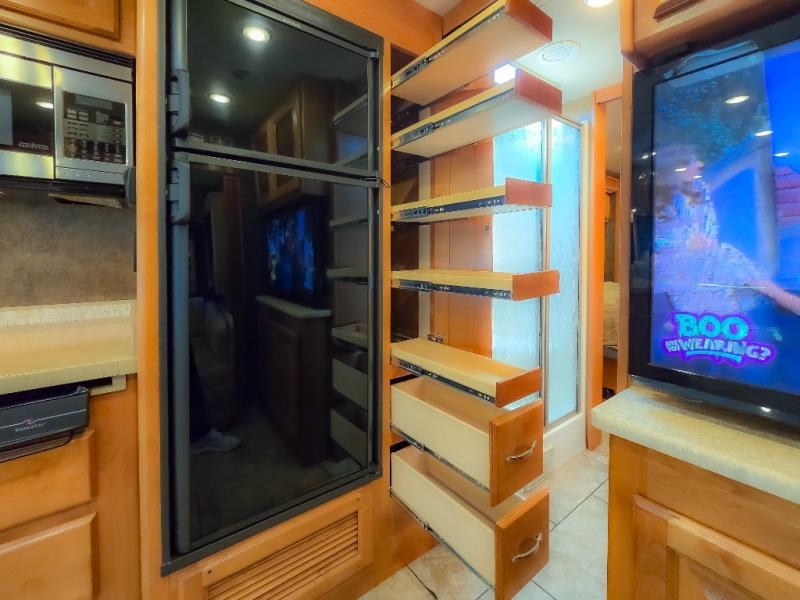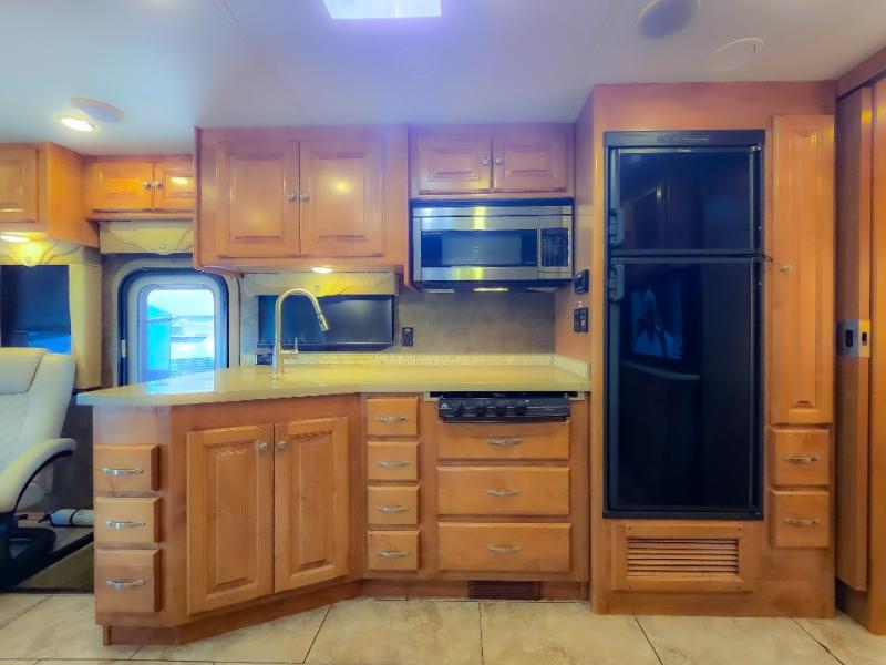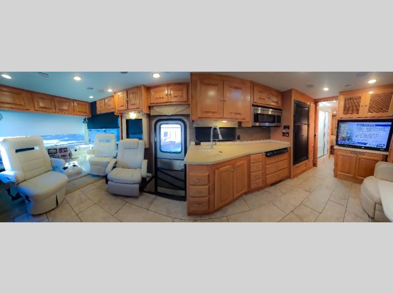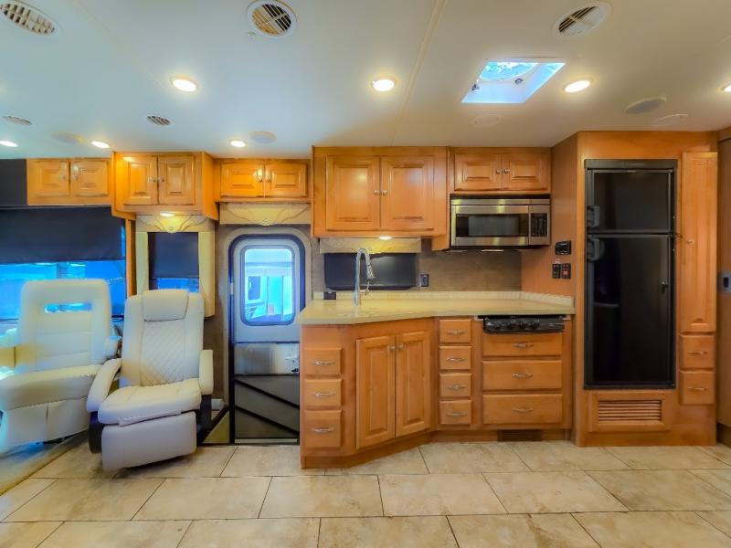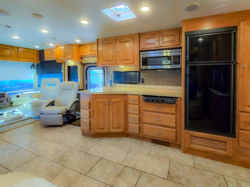 The kitchen along the curb side includes a pantry, refrigerator, three burner range, overhead microwave, angled double sink and overhead cabinets. A lounge chair and ottoman are just beyond the entry steps, with more overhead cabinets.
