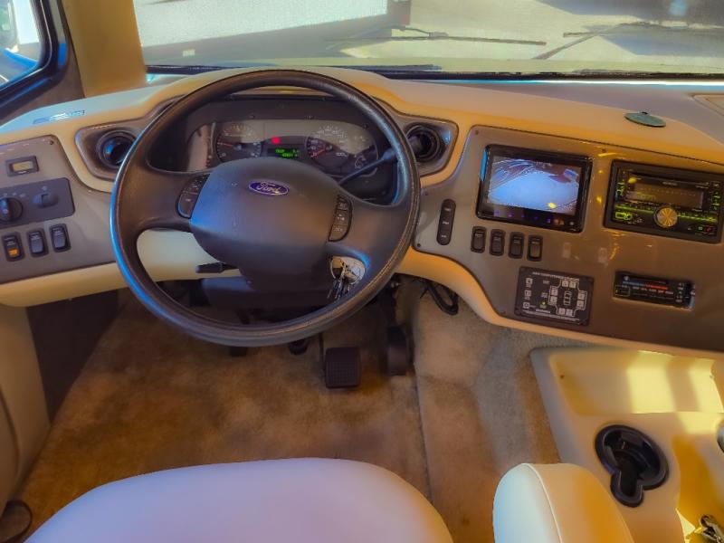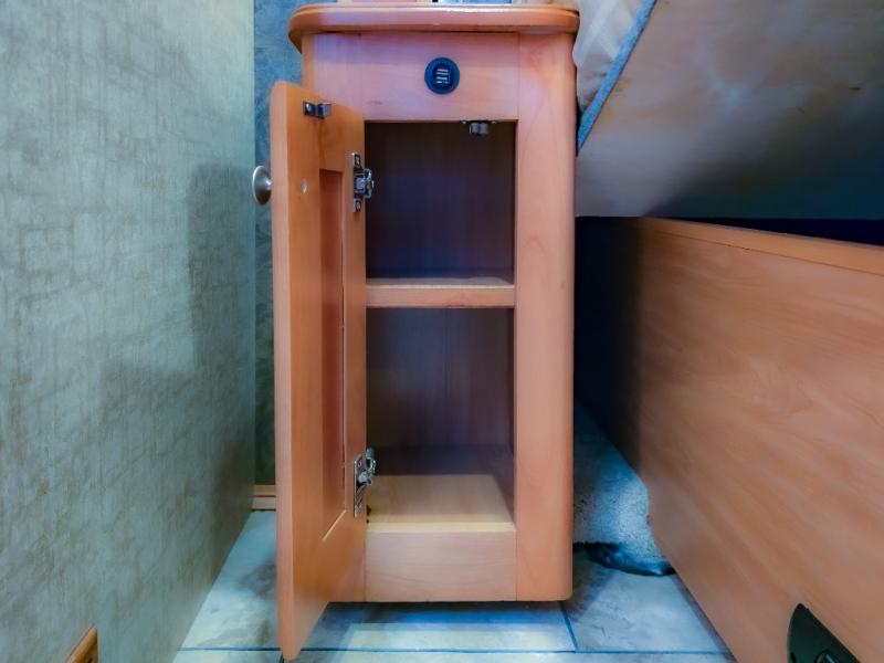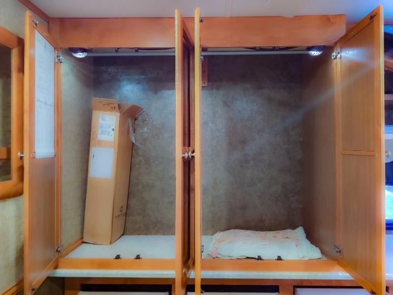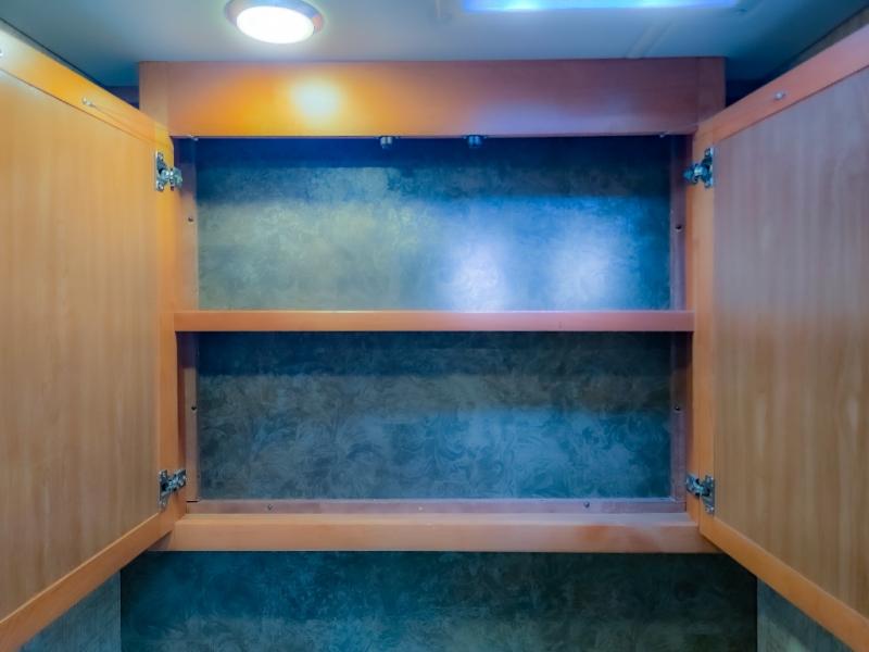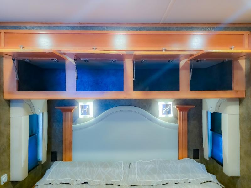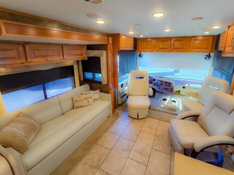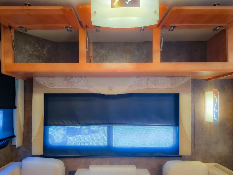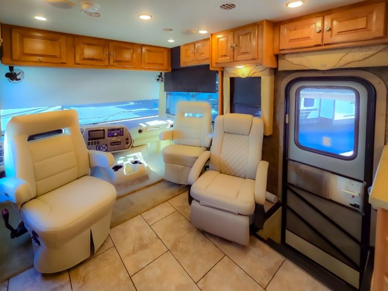 In the cab area you will find two captain's chairs, overhead cabinets at each side, an optional center TV and an optional driver side door.