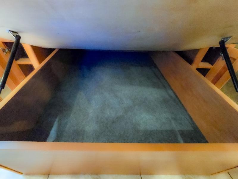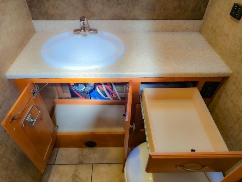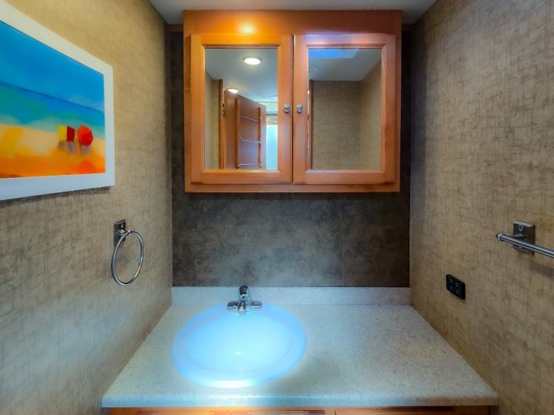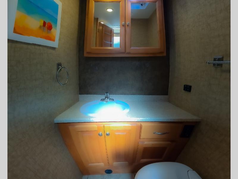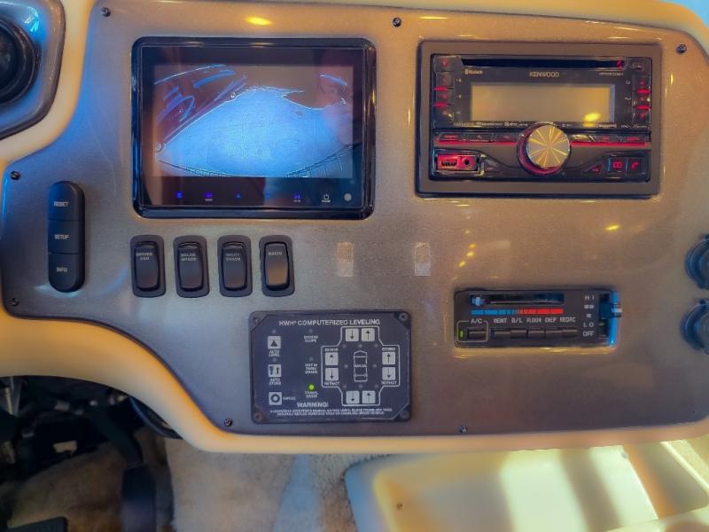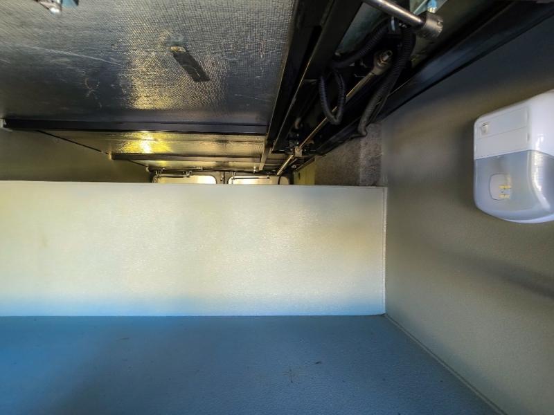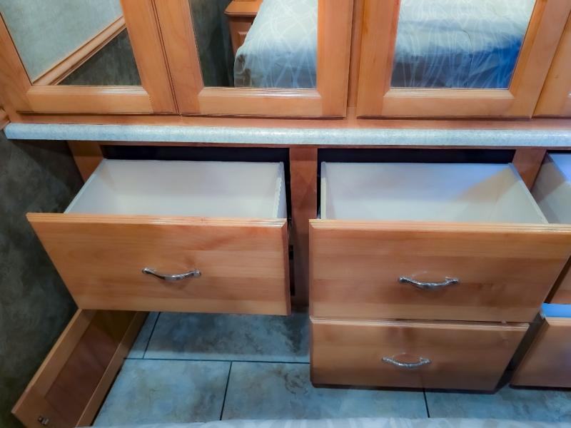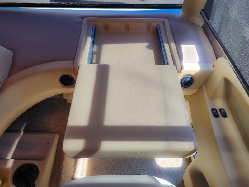 In the cab area you will find two captain's chairs, overhead cabinets at each side, an optional center TV and an optional driver side door.