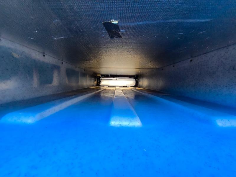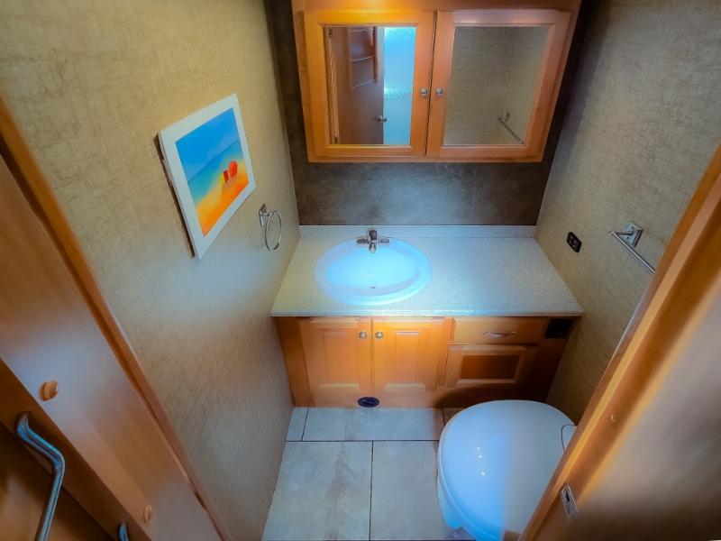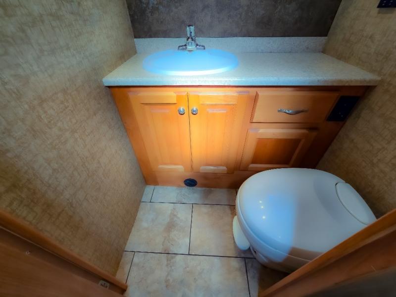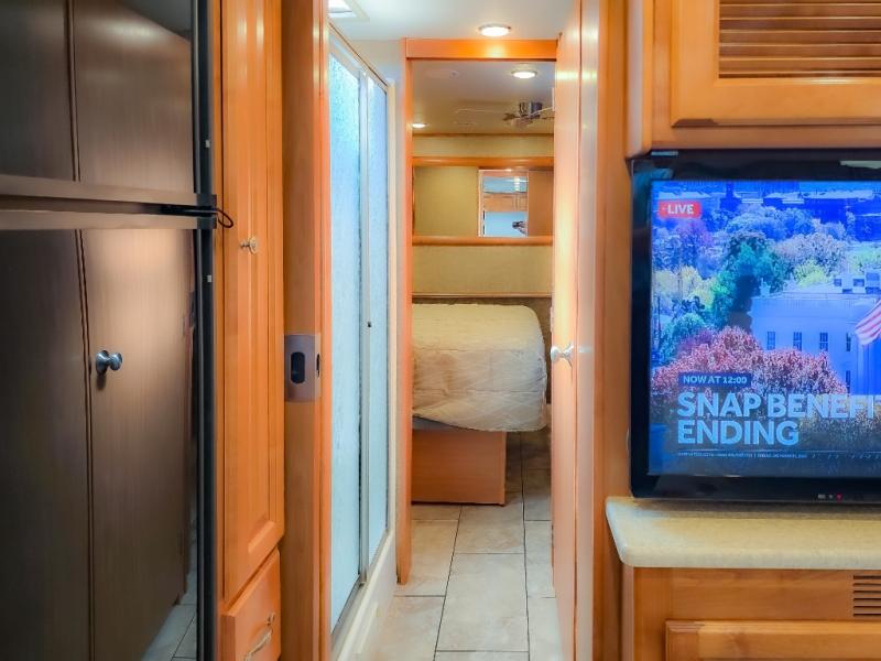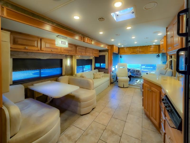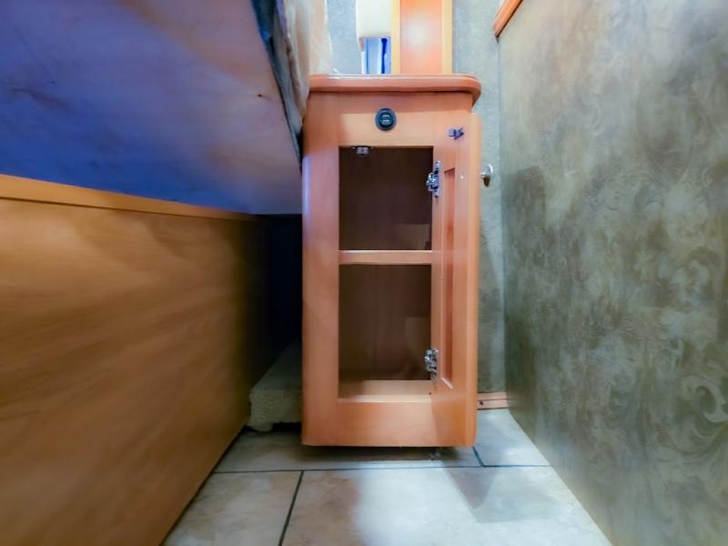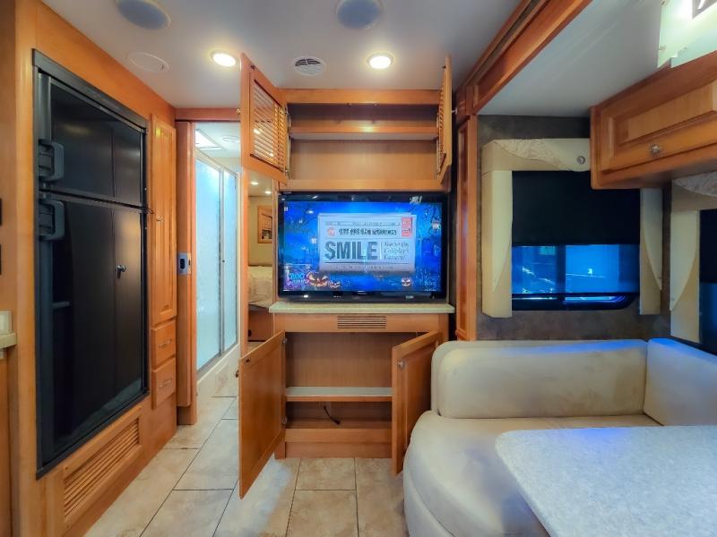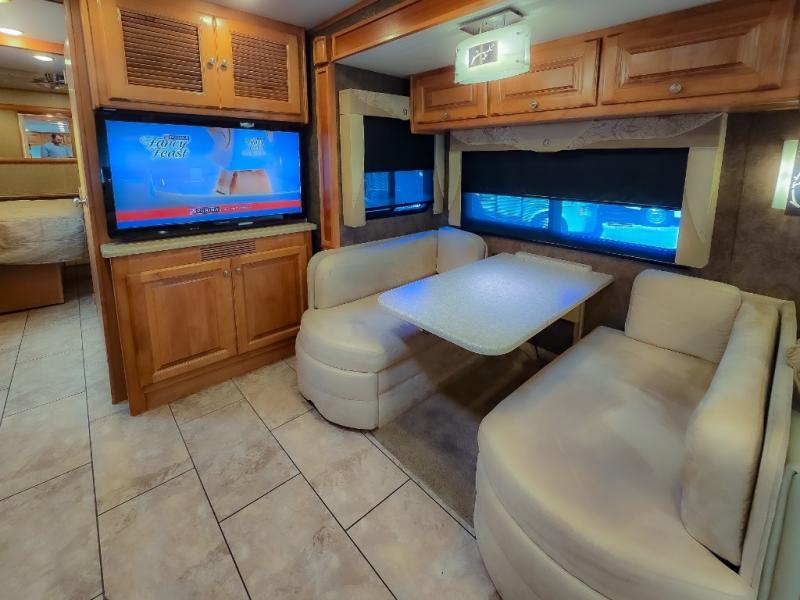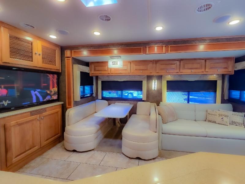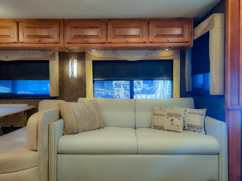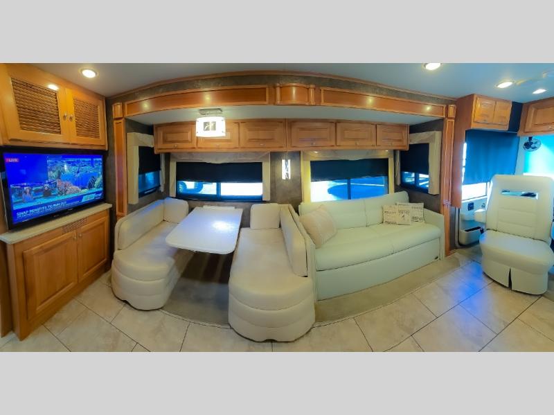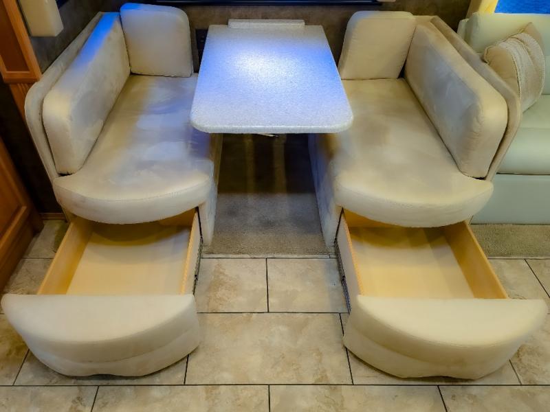 The road side includes a large slide with sofa bed, booth dinette and overhead cabinets. You may choose an optional dinette with computer workstation in place of the booth dinette. A standard TV is mounted at the back of the living area for easy viewing from any seat.