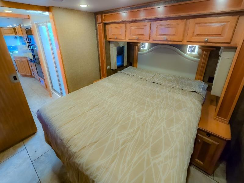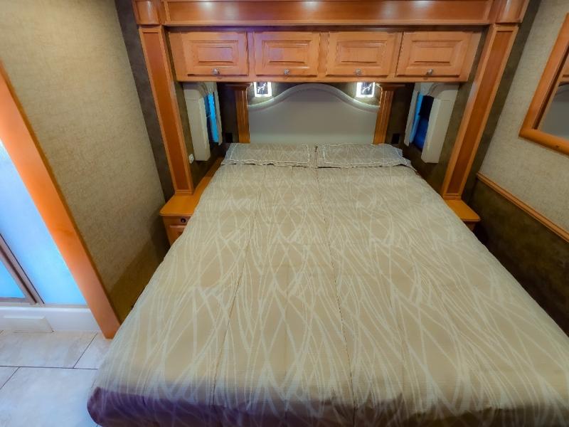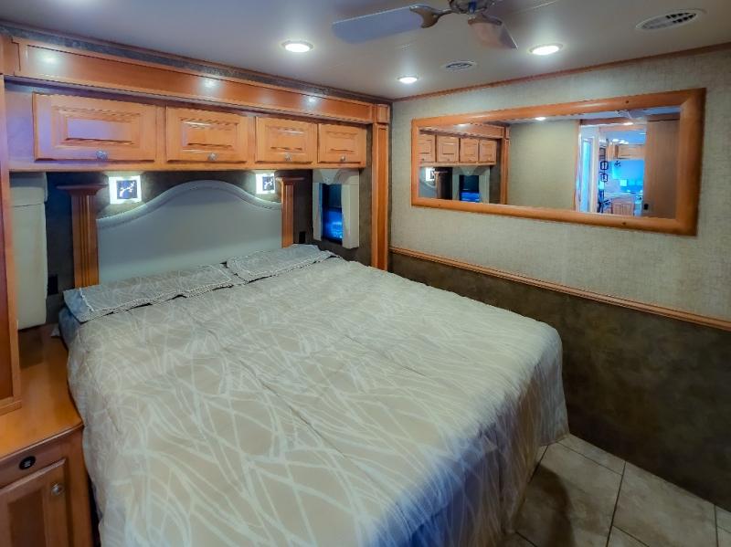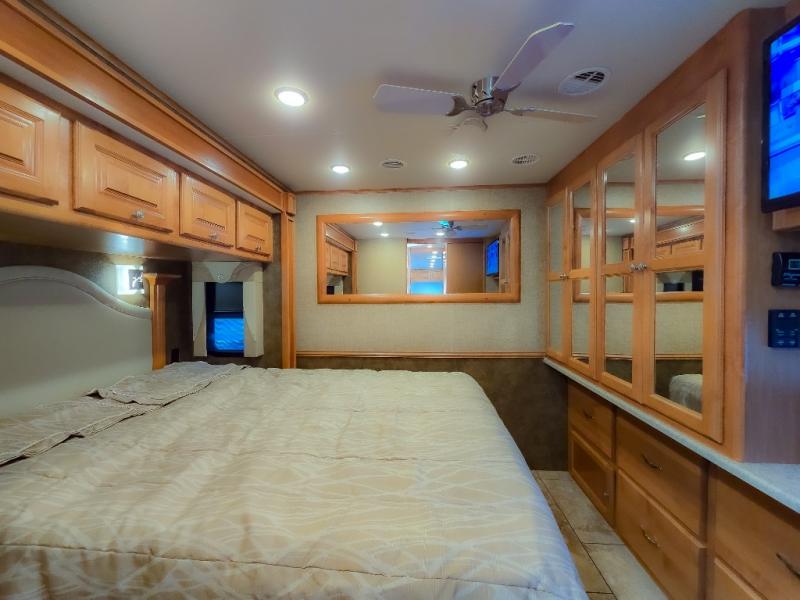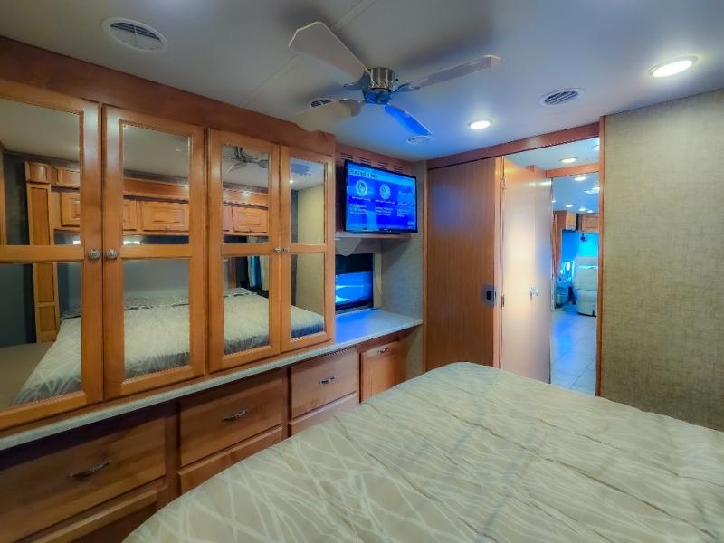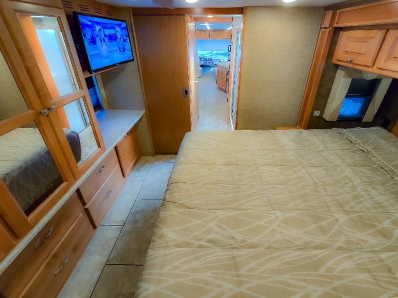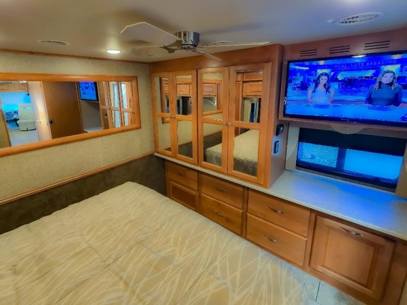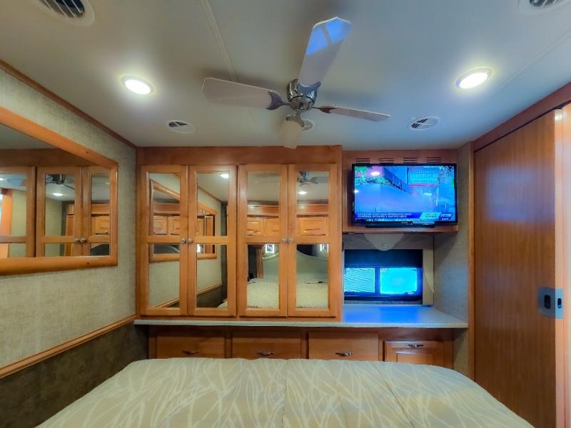 The rear bedroom provides a queen bed slide out with nightstands at each side of the bed and overhead cabinets above the head of the bed. The opposite wall includes a wardrobe with drawers below and a vanity with a TV above it.