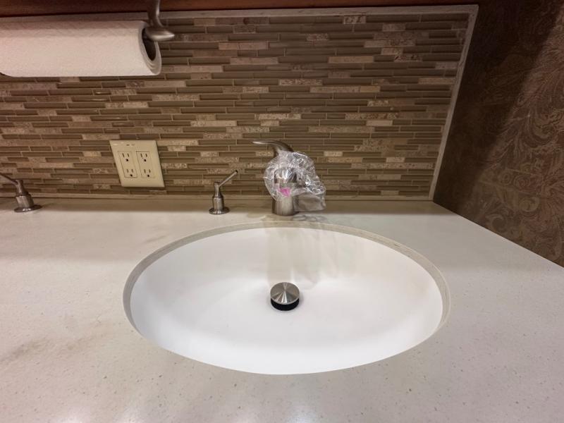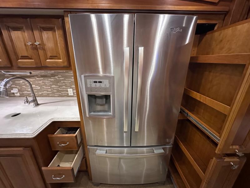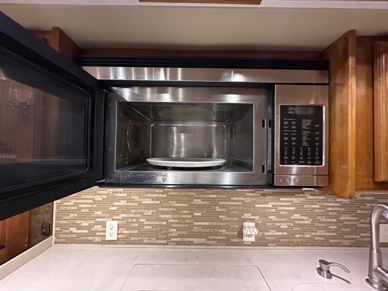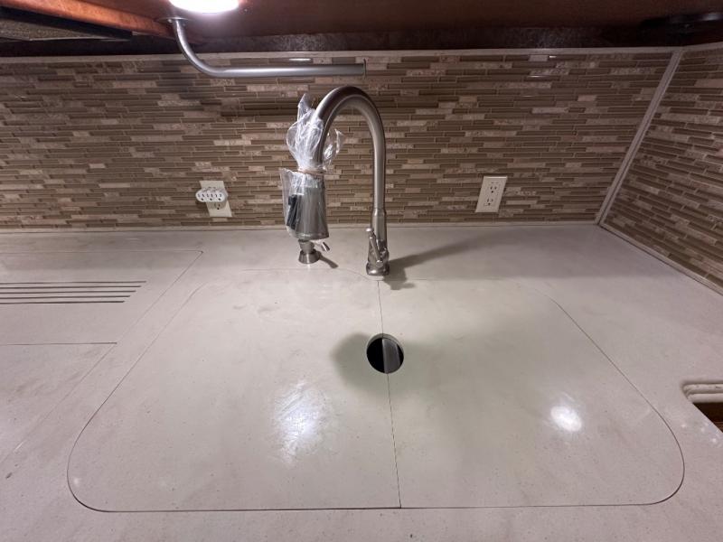 Moving down the curb side, another larger slide out holds a booth dinette, overhead cabinets, counters, an optional drawer type dishwasher, a range, overhead convection microwave, double kitchen sink, residential refrigerator and pantry. You may choose an optional exterior TV, an optional u-shaped dinette or an optional dinette with computer workstation.