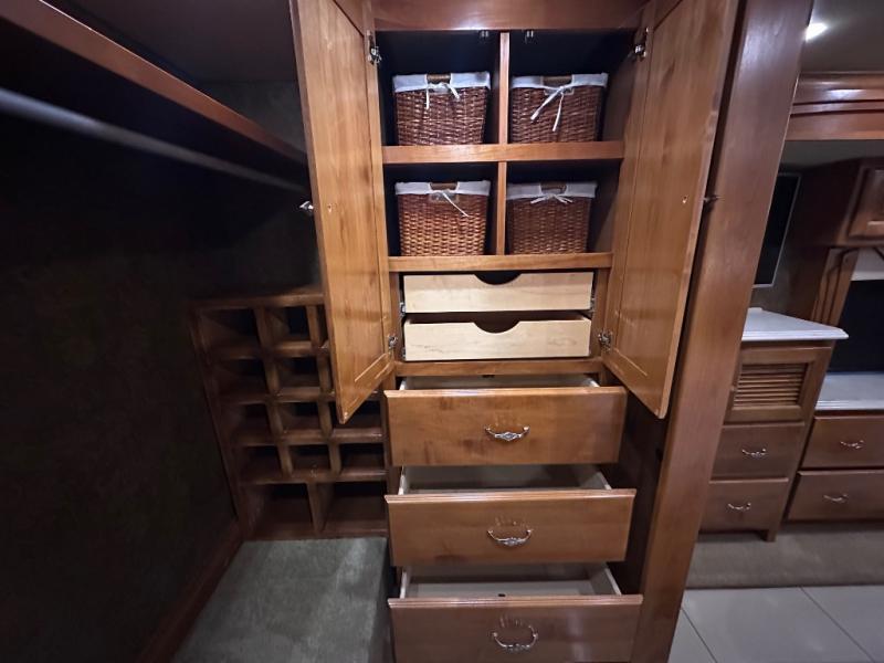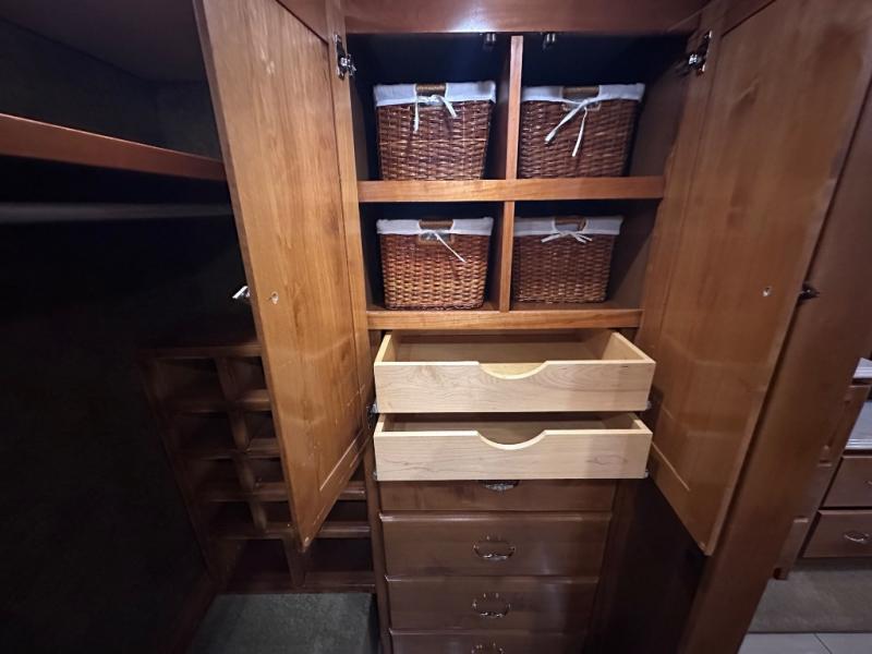 At the rear of this class A diesel coach there is a shelf with hanging rod below, drawers, and a closet for an optional washer/dryer all within a walk in wardrobe.