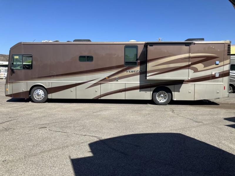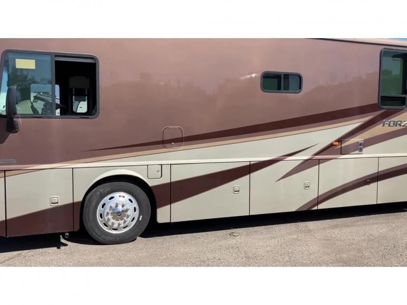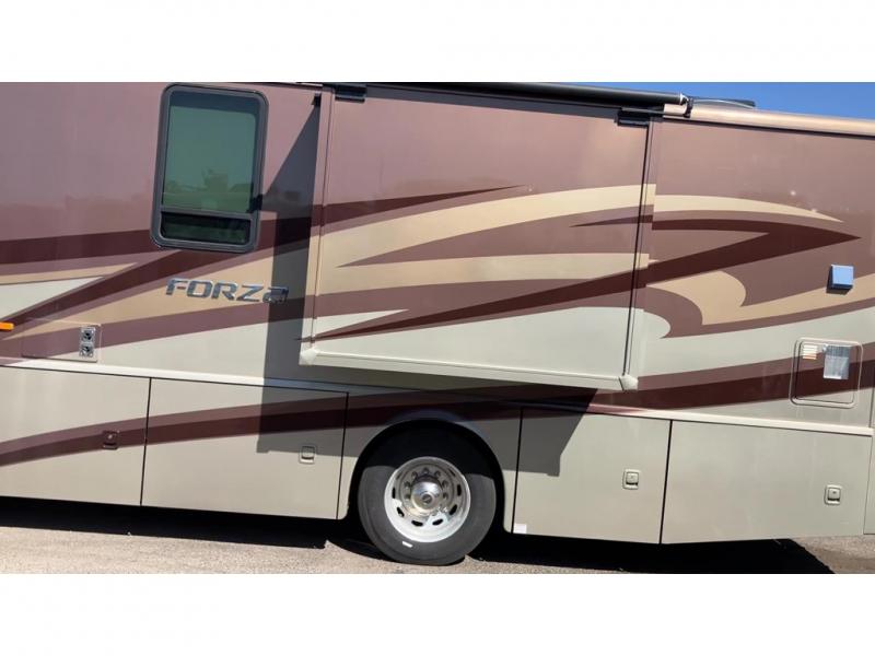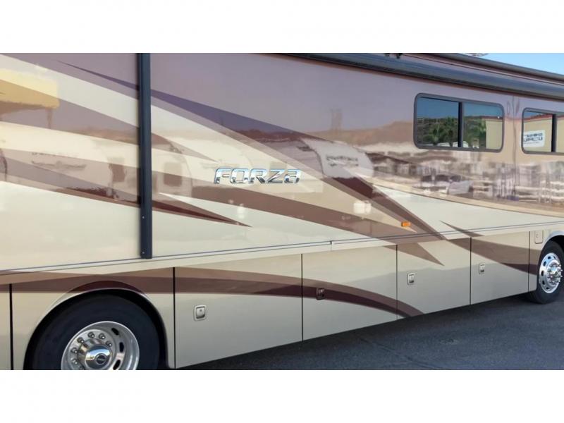 A full wall slide, bunk beds, and a bath and a half are what make this Forza class A diesel standout. This unit easily sleeps 7 and makes a perfect traveling home.