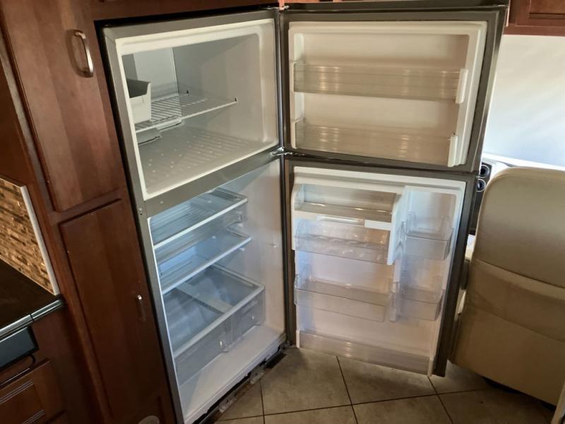Back up front on the right side notice a residential refrigerator to keep thing cold and fresh. There is also a pantry for dry and canned good storage, a three burner range, and a double kitchen sink to make cleaning up a cinch.