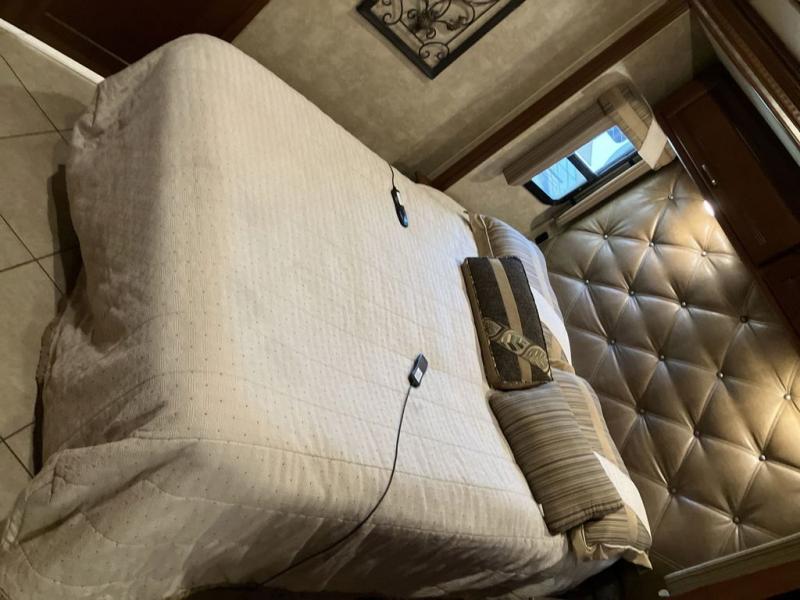 Next, a sliding door to the master bedroom and rear full bath. The queen bed slides out with dual nightstands for added space to walk around. There is a flip down 28" HDTV above the foot of the bed for added convenience.