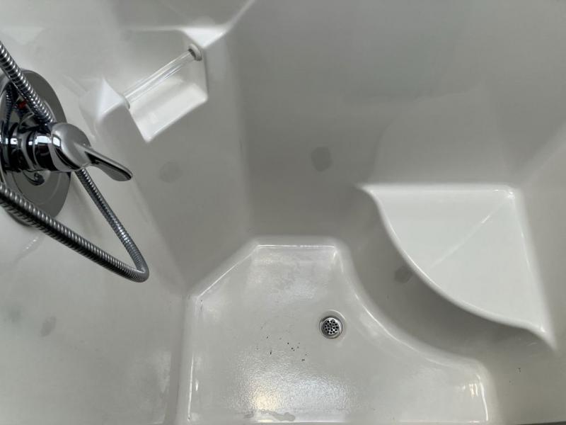The rear bathroom offers a washer and dryer, vanity with sink, shower, and toilet, plus so much more!
