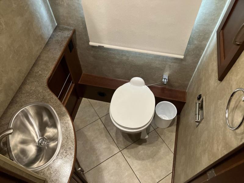 A convenient half bath with toilet and vanity with sink and storage is located across from the bunks.