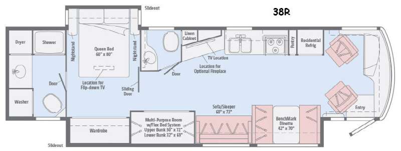 Heading back on the left side is a full wall slide out providing plenty of extra foot traffic space to move about. There is a 42" x 70" dinette for meal time, a sofa sleeper is next, and a multi-purpose room with flex bed system including an upper bunk that is 30" x 72" and a lower bunk that is 32" 69". There is also a spacious wardrobe in this full wall slide that ends directly across from the queen bed in the master bedroom.