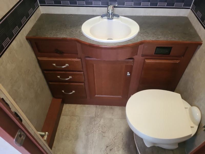 A second sliding door separates the bathroom from the bedroom and features a queen size bed slide with nightstands, wardrobe, chest of drawers along with a 28" HDTV above, and a storage cabinet that can also be used as the location for a washer and dryer if you wish to add, plus more!