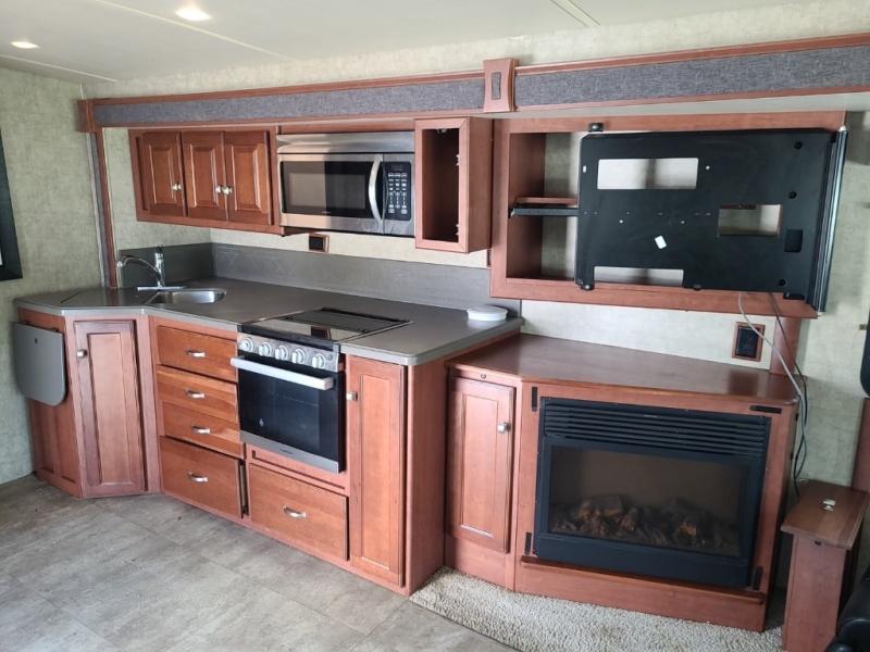 Step inside and find a large slide out inLounge to your right featuring seat belts, and the ability to extend for added seating. There is a slide opposite that features an inTable, recliner, 48" HDTV with electric fireplace below, counter space, a three burner range, and double kitchen sink. The 4-door refrigerator/freezer is opposite just to the left of the main entrance.