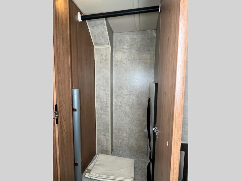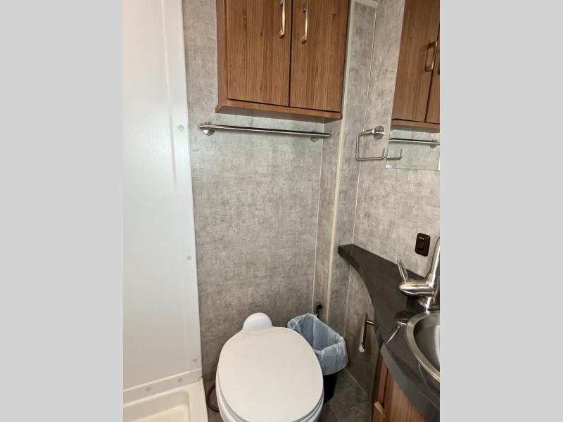 Beyond the sofa heading toward the rear of the coach you will find a side bath with corner shower, toilet, linen cabinet, and vanity with round sink. A nice size wardrobe is found just around the corner from the bath before you step up to the bedroom floor area.