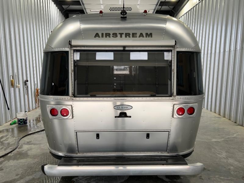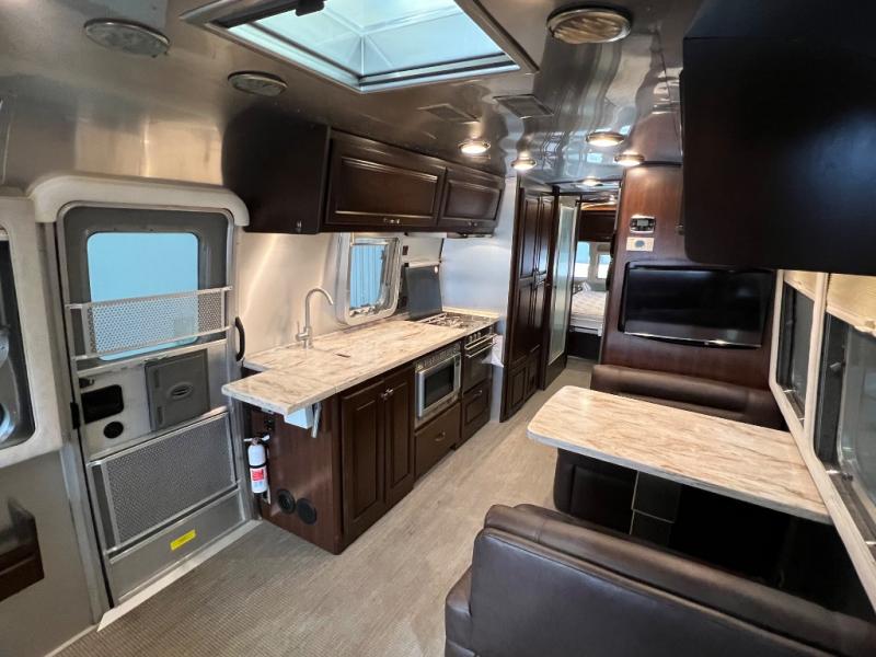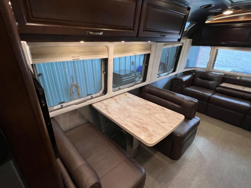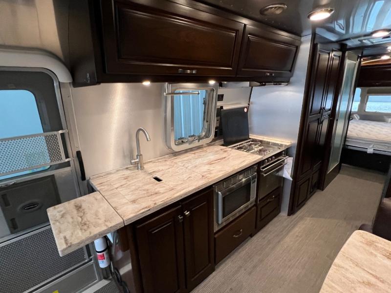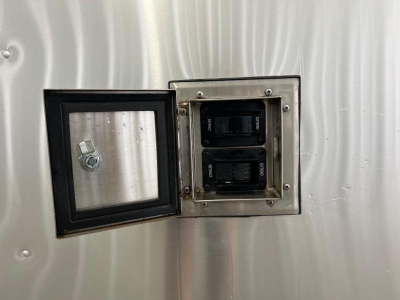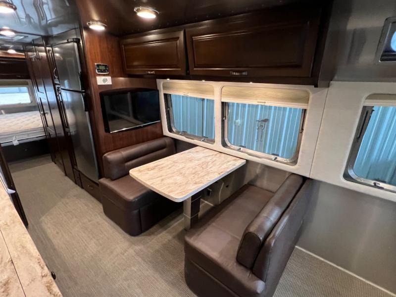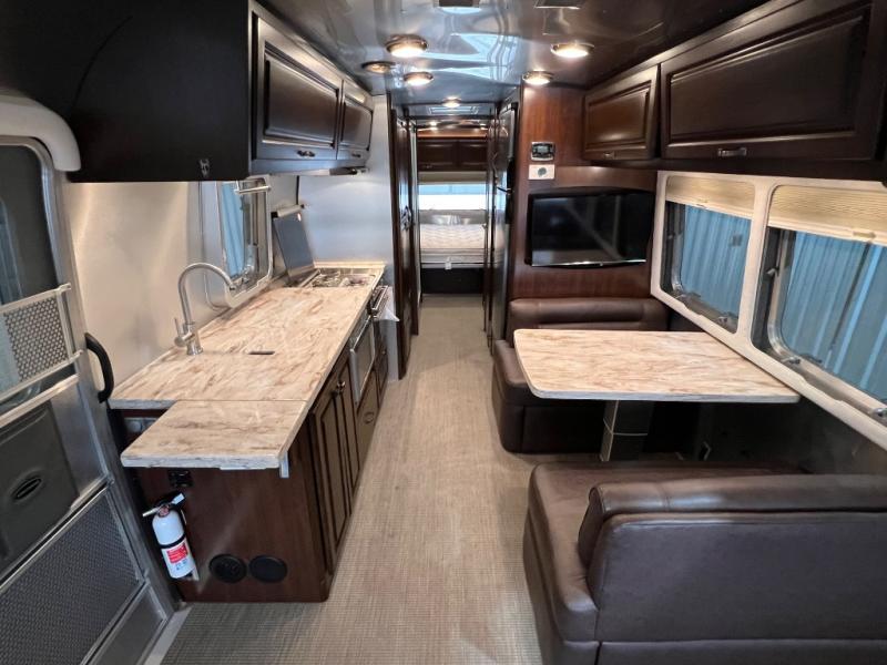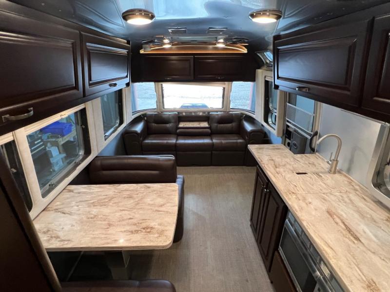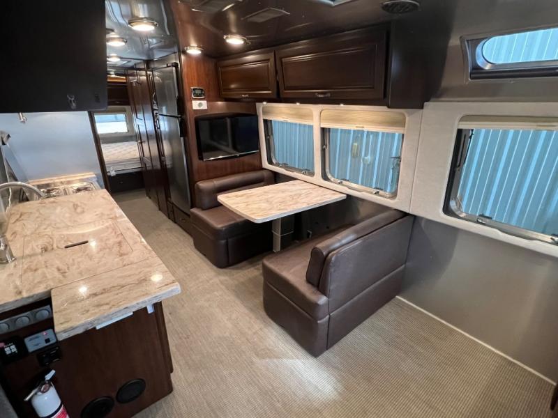 The galley has a double kitchen sink, three burner range. On the opposite side of the trailer you will find a dinette, LED TV above the dinette, refrigerator and slide out pantry.