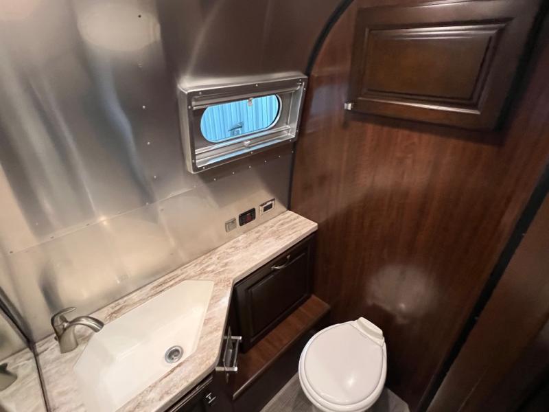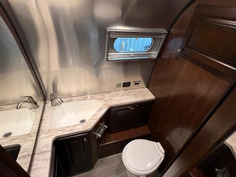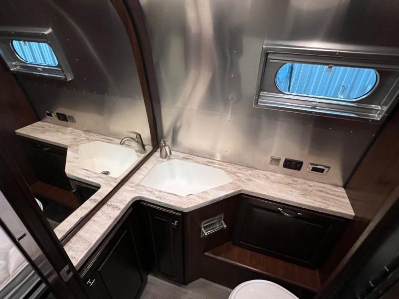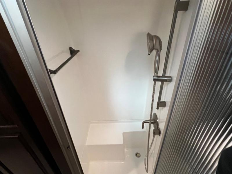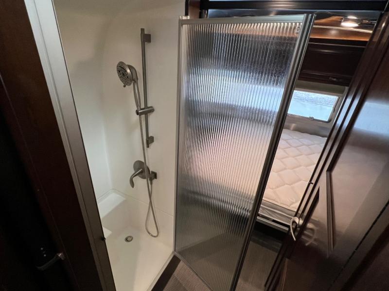The bathroom has a private toilet area and sink on one side of the trailer. Across from the toilet area there is a shower and large wardrobe.
