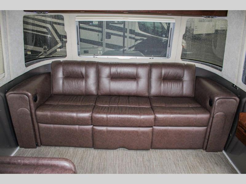As you enter the travel trailer, along the front wall of the trailer there is a sofa with power recliners.