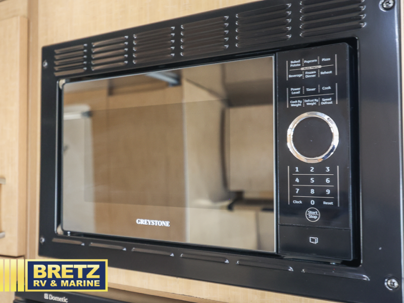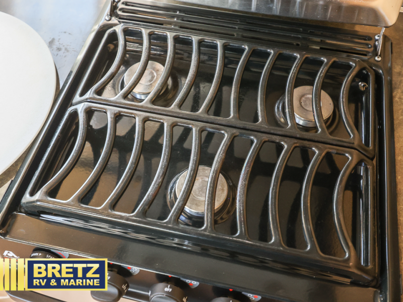 The galley offers a sink and three burner range on one side, and a refrigerator, microwave, and pantry on the other side of the trailer.