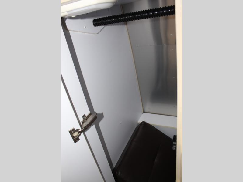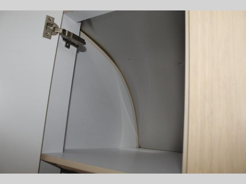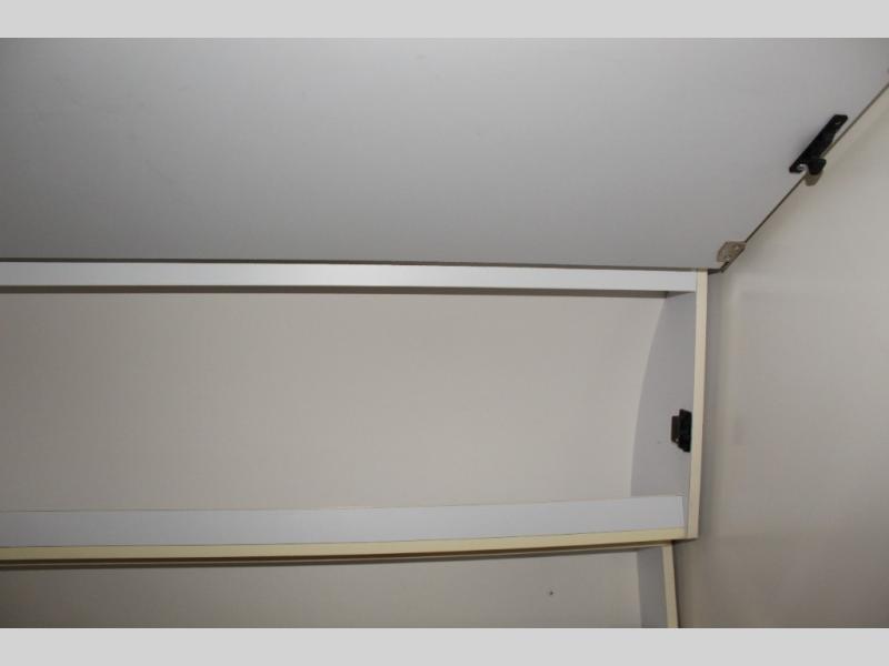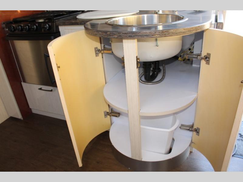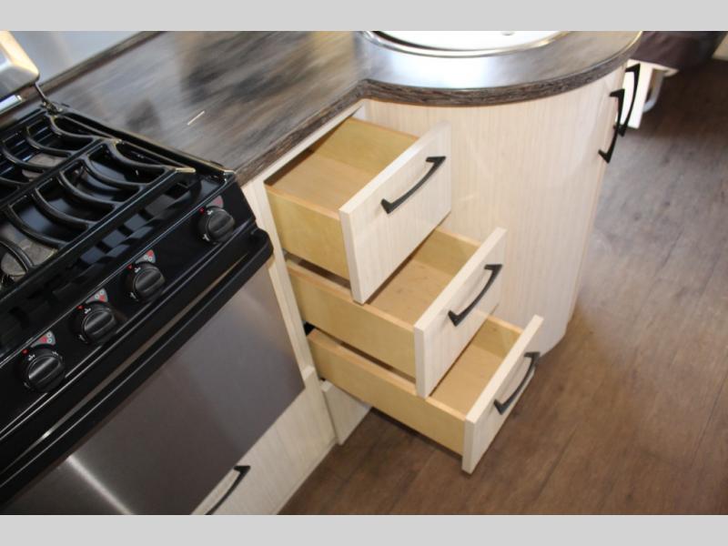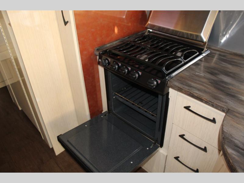 The galley has a sink, three burner range, and pantry on one side of the travel trailer. On the opposite side you will find a refrigerator.