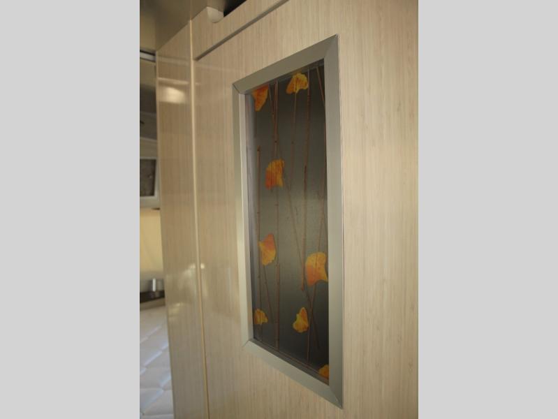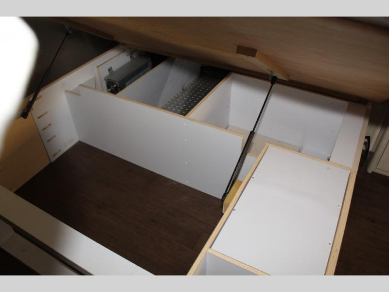 Along the rear wall you will find a dinette. Next to the dinette there is a sofa with a LED TV above the sofa.