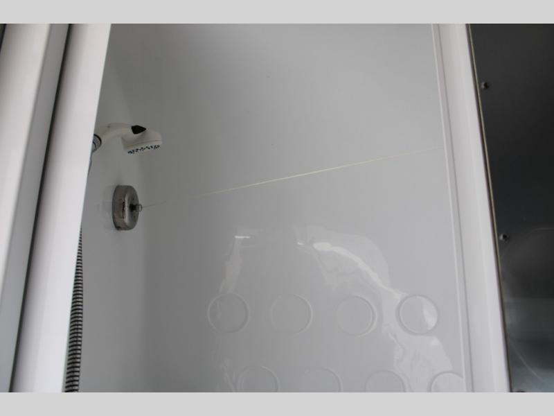 As you enter the travel trailer, in the rear you will find the bathroom with a shower, sink, and toilet.