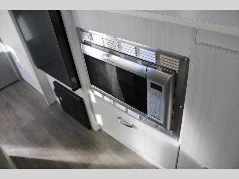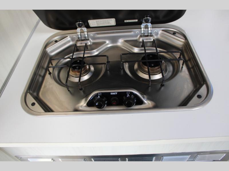 One side of the travel trailer has a u-dinette/bed. The opposite side offers a storage cabinet, LED TV, refrigerator, two burner range, sink, and lots of extra counter space.