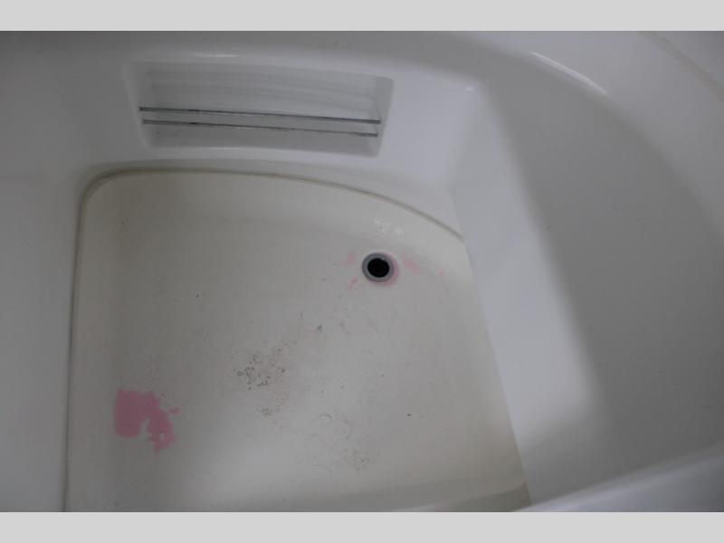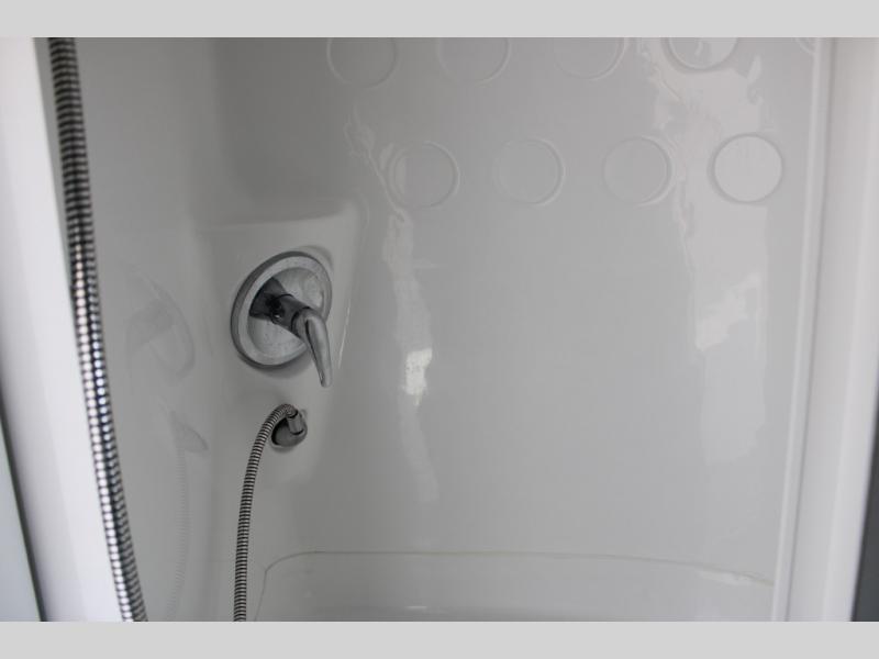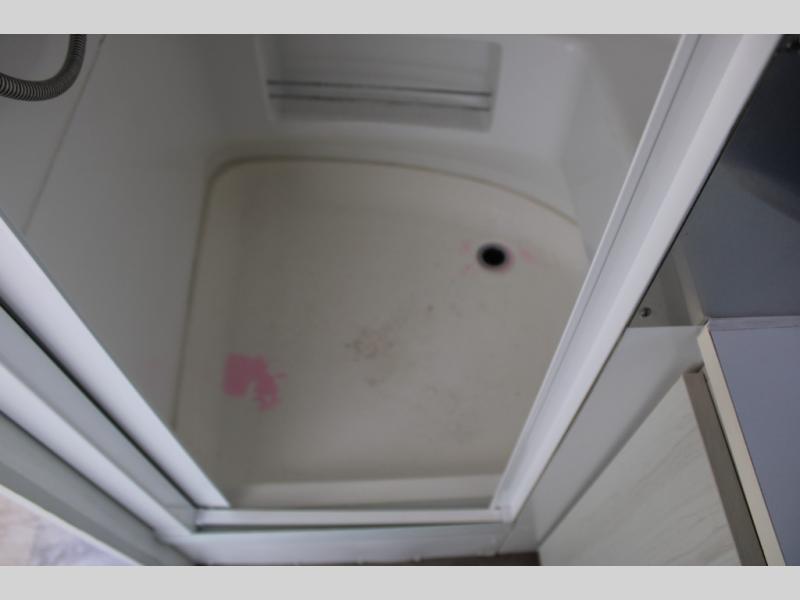 As you enter the travel trailer, in the rear you will find the bathroom with a shower, sink, and toilet.