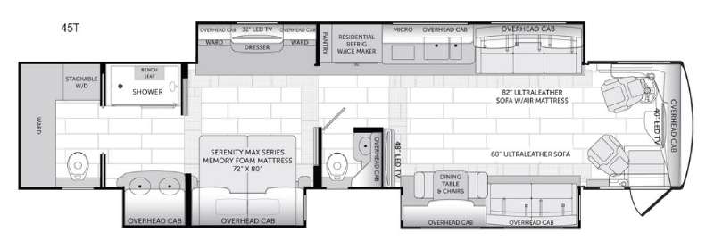 As American Coach’s flagship model, the Eagle 45T offers unmatched comfort, technology, and performance. It’s designed for serious travelers who want the very best—whether for long-term journeys, resort stays, or full-time living. With its powerful drivetrain, luxurious finishes, and smart floorplan, it’s more than a motorhome—it’s your rolling luxury estate.