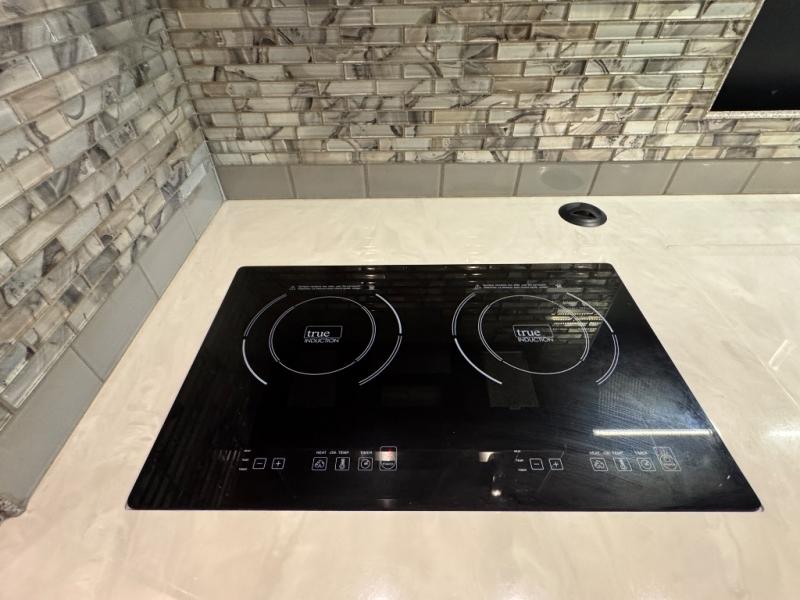 Residential kitchen with solid-surface countertops, induction cooktop, convection microwave, dishwasher, and residential refrigerator
