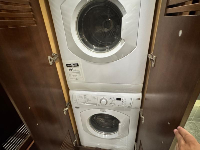 Spa-inspired rear master bath with dual vanity, oversized glass shower, and stacked washer/dryer