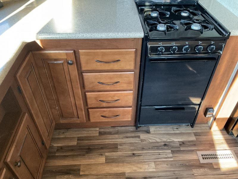As you enter the sliding patio doors, you are in the living room with a corner entertainment center to your left. Across the room, a large slide out has a recliner, sofa and a free standing dinette with four chairs.