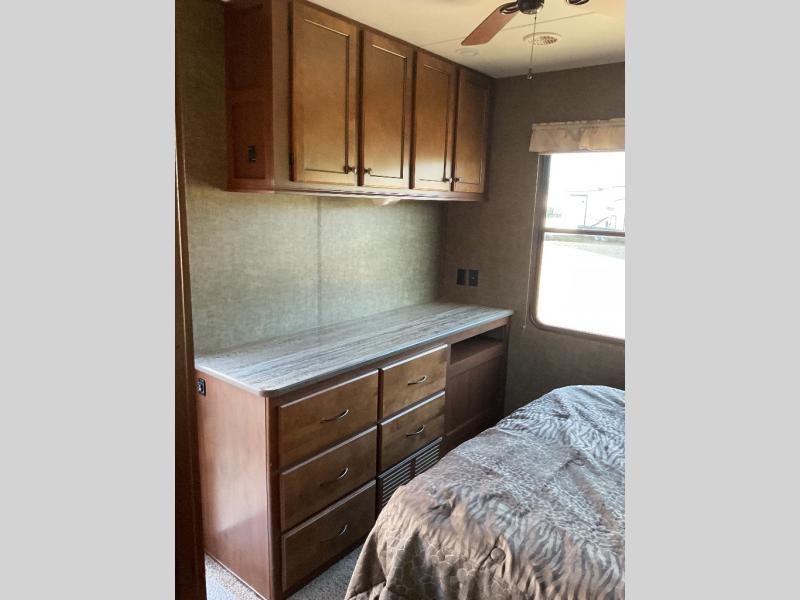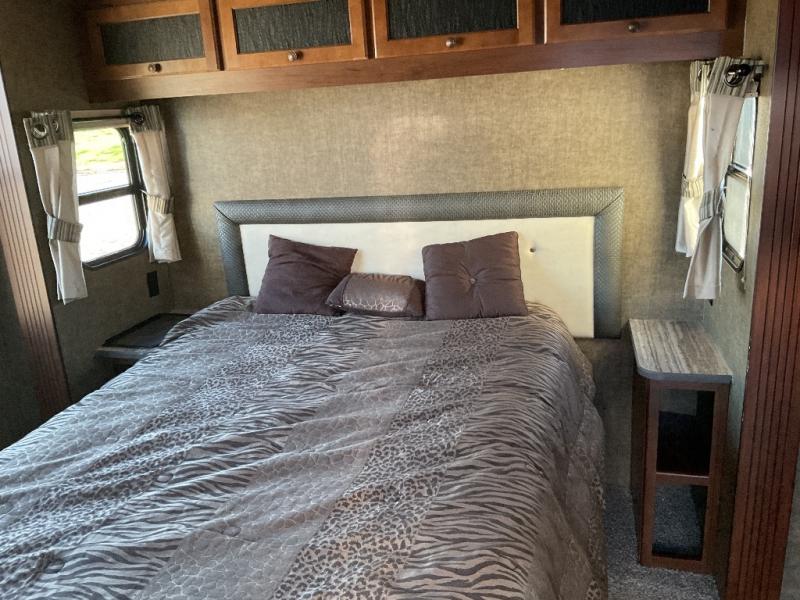 The rear bedroom includes a queen bed with nightstands at each side and overhead cabinets within a slide out. There is a chest of drawers, a large closet and a private entry/exit door within the room as well, and more!