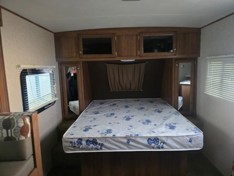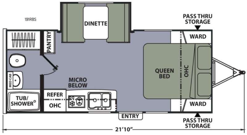 As you enter model 191RBS notice the queen size bed up front. On both sides find a wardrobe for storage, and the overhead cabinet also helps keep things neat and tidy with additional storage for your things.