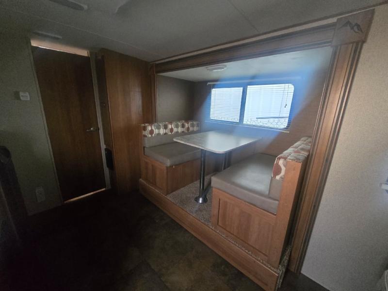 To the left of the main entry door find a double sink, a two burner cook-top with microwave oven beneath, and a refrigerator to keep all of your perishables cold and fresh. There is also a pantry just off the dinette slide for all of your dry and canned food storage needs.