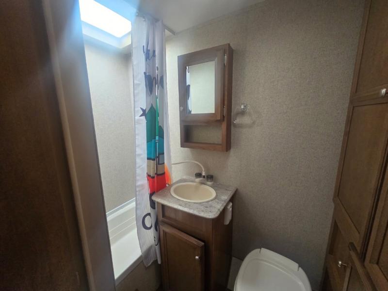 The rear complete bath offers a tub/shower, vanity with sink including a medicine cabinet, toilet, and wardrobe for all of your hanging clothes, plus so much more!