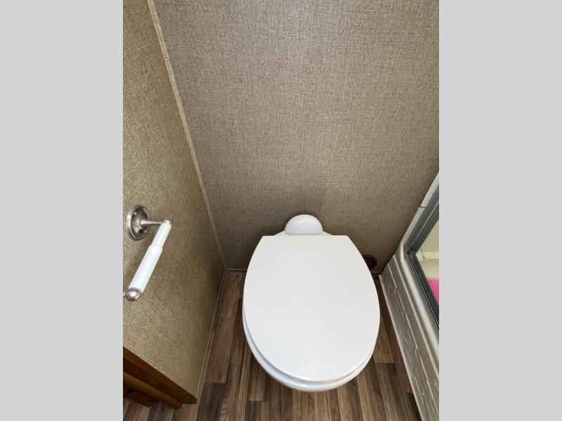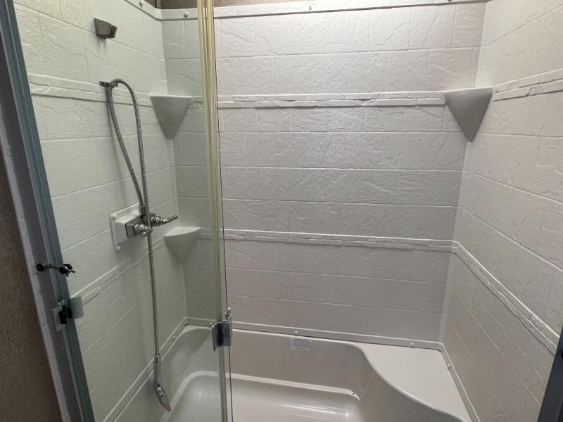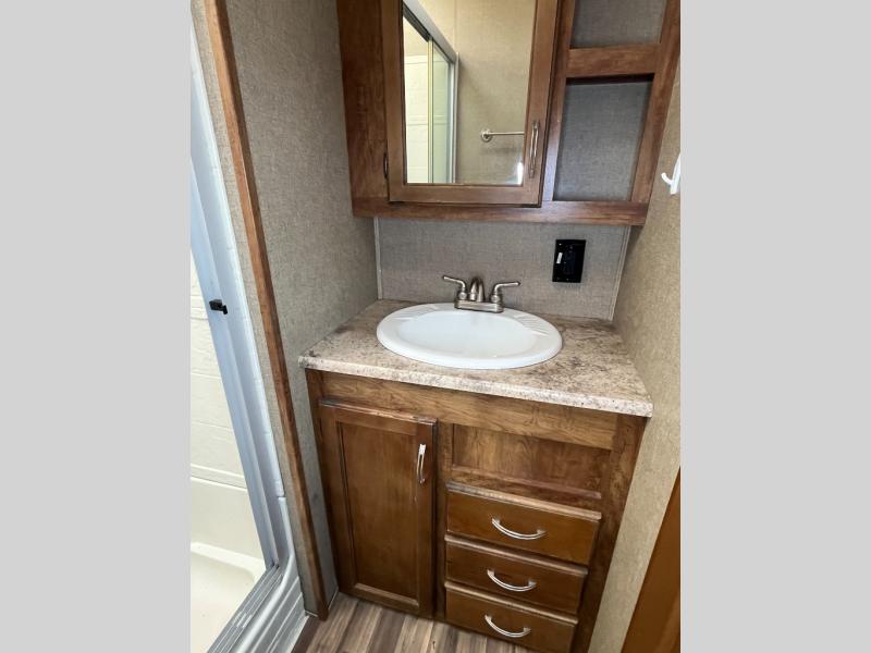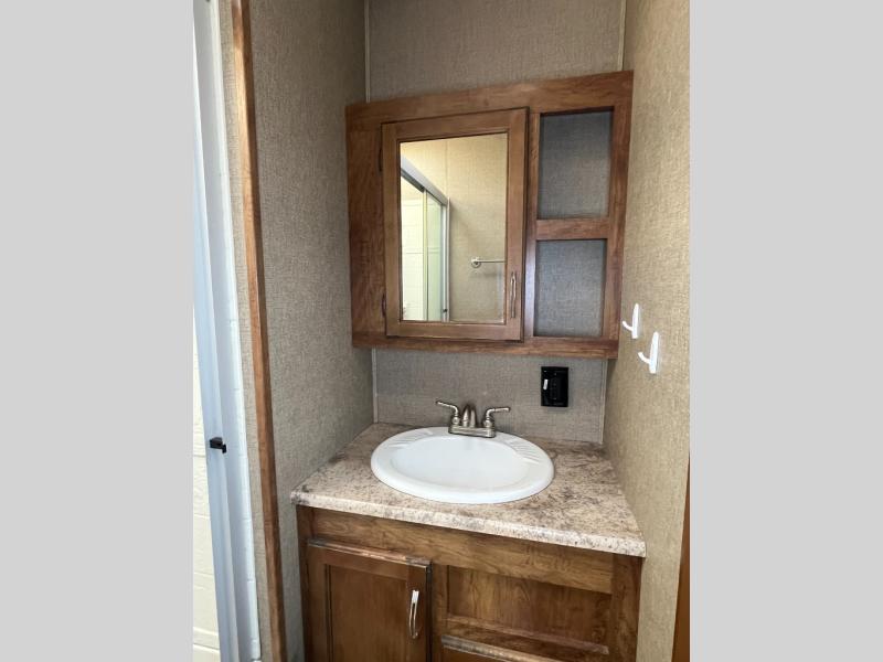 Heading towards the back, the side aisle bathroom includes a shower with a seat, sink with medicine cabinet, and a toilet. Just across from the bath door is the second entry into the fifth wheel for quick access to the bathroom or the bedroom.