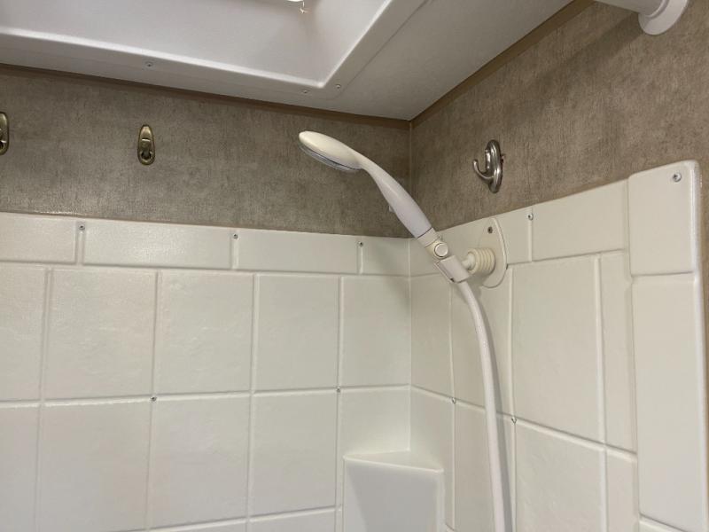 In the rear of the trailer there is a complete full bath with 36" tub/shower, toilet, and sink with medicine cabinet.