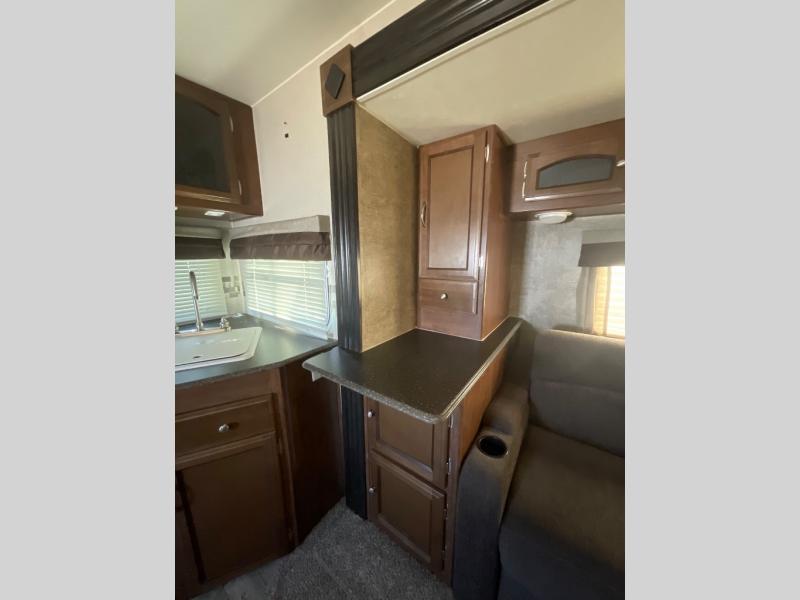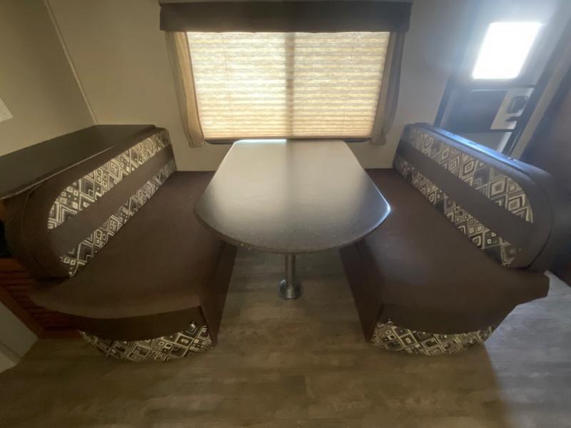 Straight in the door find a slide out sofa with end table including storage above, plus a pantry. More seating is available on the opposite side in the booth dinette that also features overhead cabinets, and a flat screen TV along the outer bathroom wall.