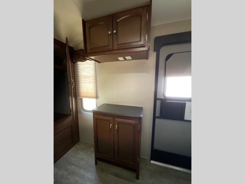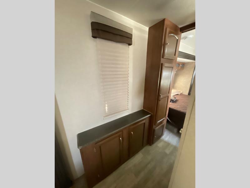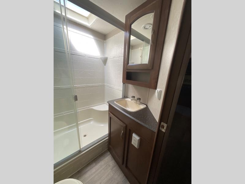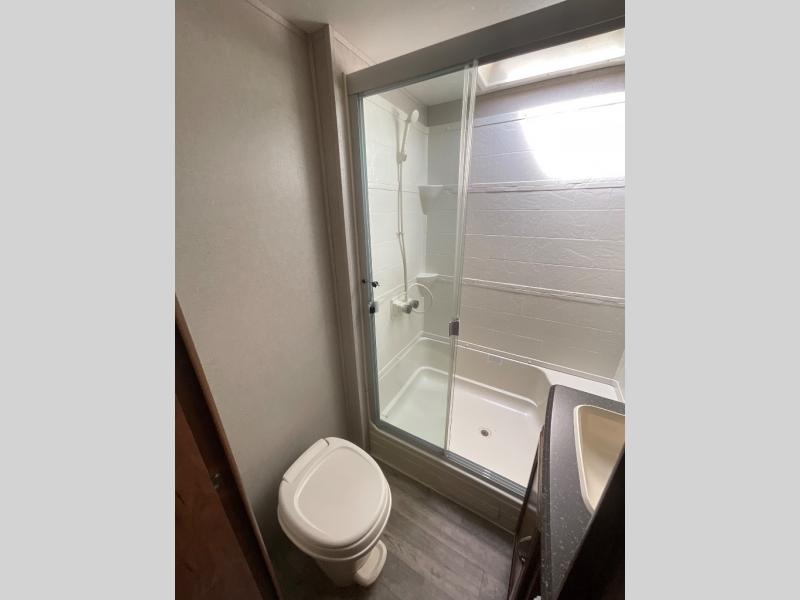 There is a hutch base along the road side just beyond the sofa slide out which is next to a linen storage cabinet. Opposite a convenient bathroom featuring a shower, toilet, and a vanity with sink, plus overhead cabinet.