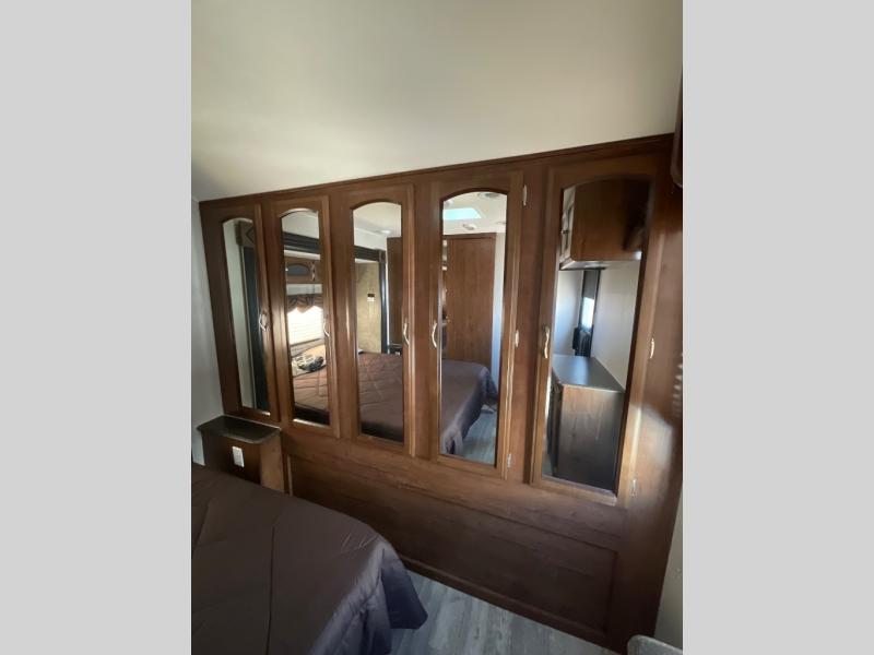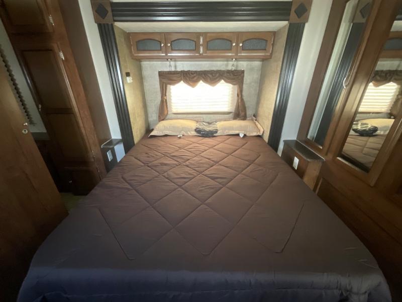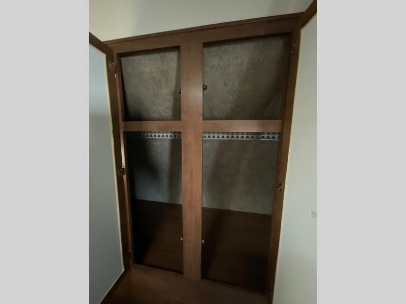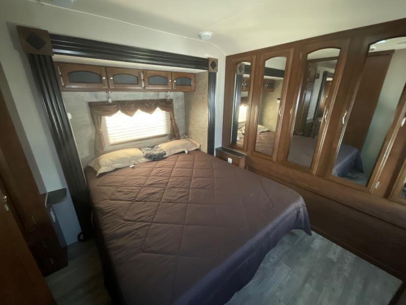 A sliding hallway door leads into the front private master bedroom which features its own exterior entry/exit door. Inside find a queen bed slide out, a dresser, and a full front wardrobe with exterior pass-through storage beneath, and so much more!